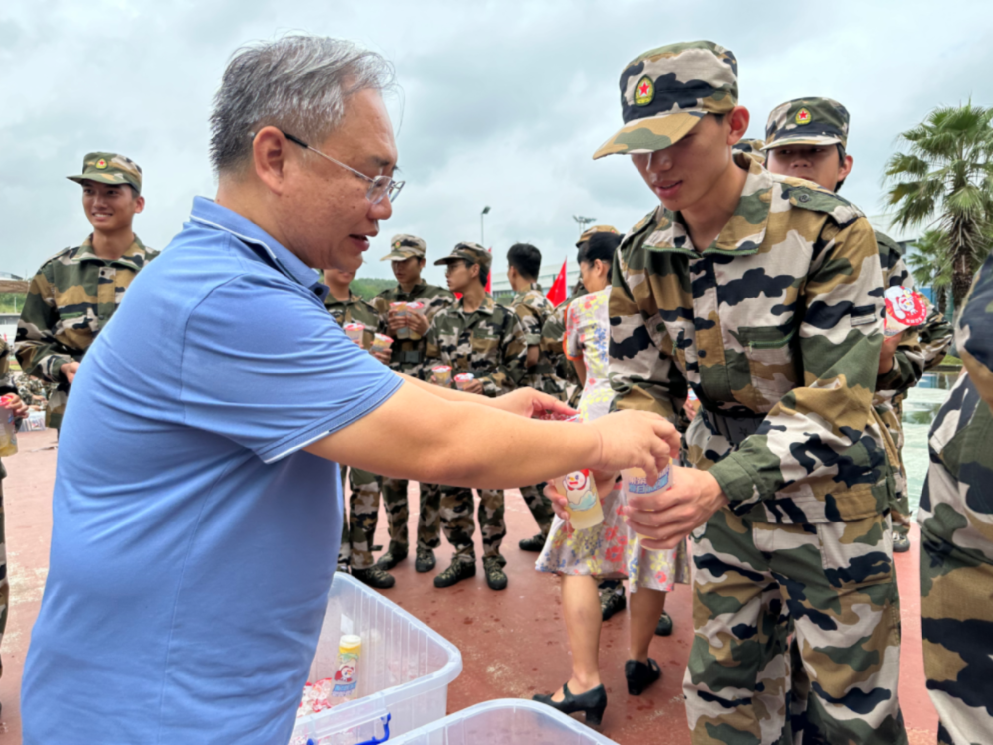为充分了解军训情况,进一步鼓舞学生军训士气,保证军训工作有序进行,9月9日上午,经济与管理学院党委书记韦海鸣教授、副院长何玲玲教授、辅导员及2024级各班班主任等来到五合校区篮球场,看望并慰问军训教官和经管院2024级全体参训学生。