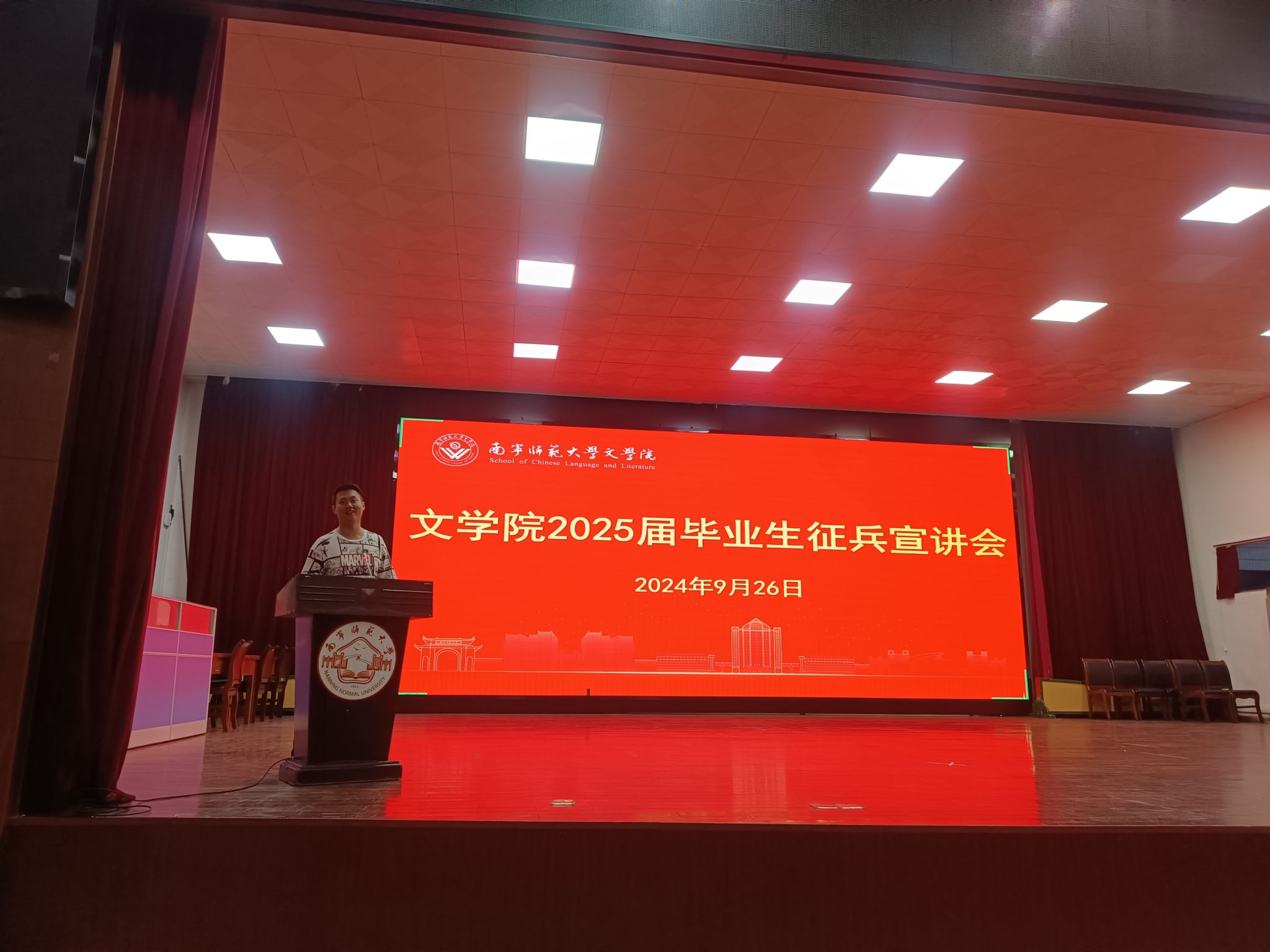 为响应国家号召,鼓励毕业生应征入伍,为祖国奉献青春力量,9月26日晚,文学院在明秀校区大礼堂召开了2025届毕业生征兵宣讲会。学院邀请21级专升本1班退役学生赵杨磊向毕业生们讲解征兵政策。