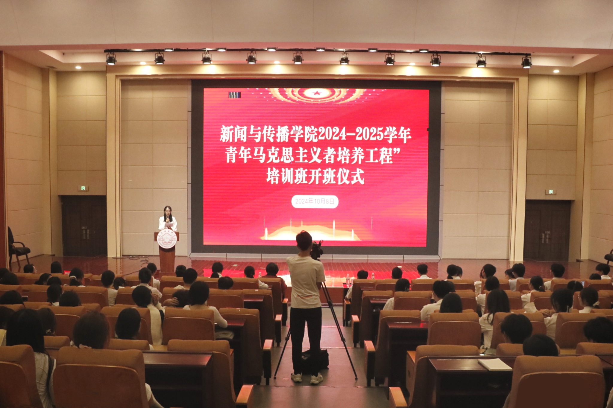 为加强对青年学生思想政治引领,10月8日18时30分,新闻与传播学院于文综楼114报告厅举行2024-2025学年“青马班”开班仪式,学院党委书记聂卉,学工办辅导员周展林、兰浩玮及“青马班”全体成员参加,仪式由学院团委书记李樱花主持。