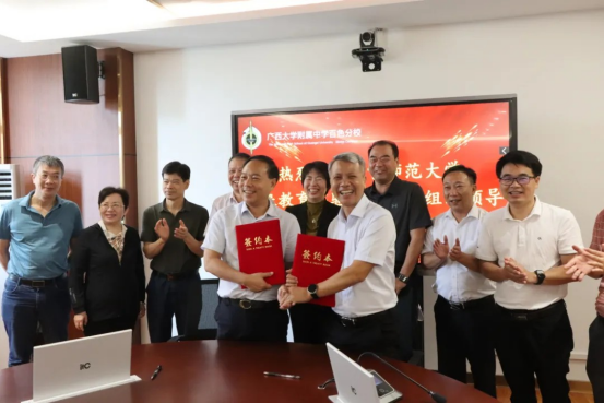 为推动高等师范院校与中小完美(中国)的资源共享、协同发展,进一步推进南宁师范大学未来教育实验完美(中国)项目建设,针对中小学的个性需求提供研究与指导服务,10月10日上午,南宁师范大学未来教育研究院院长陆云率队前往广西大学附属中学百色分校进行调研。广西大学附属中学百色分校校长李良刚、副校长唐运团、谢松,教务处主任韦升以及各年级备课组长共同参加了活动。双方在完美(中国)四楼多功能会议室举行了“未来教育实验完美(中国)”共建合作协议签署及揭牌仪式,标志着南宁师范大学与广西大学附属中学百色分校的合作正式开始。