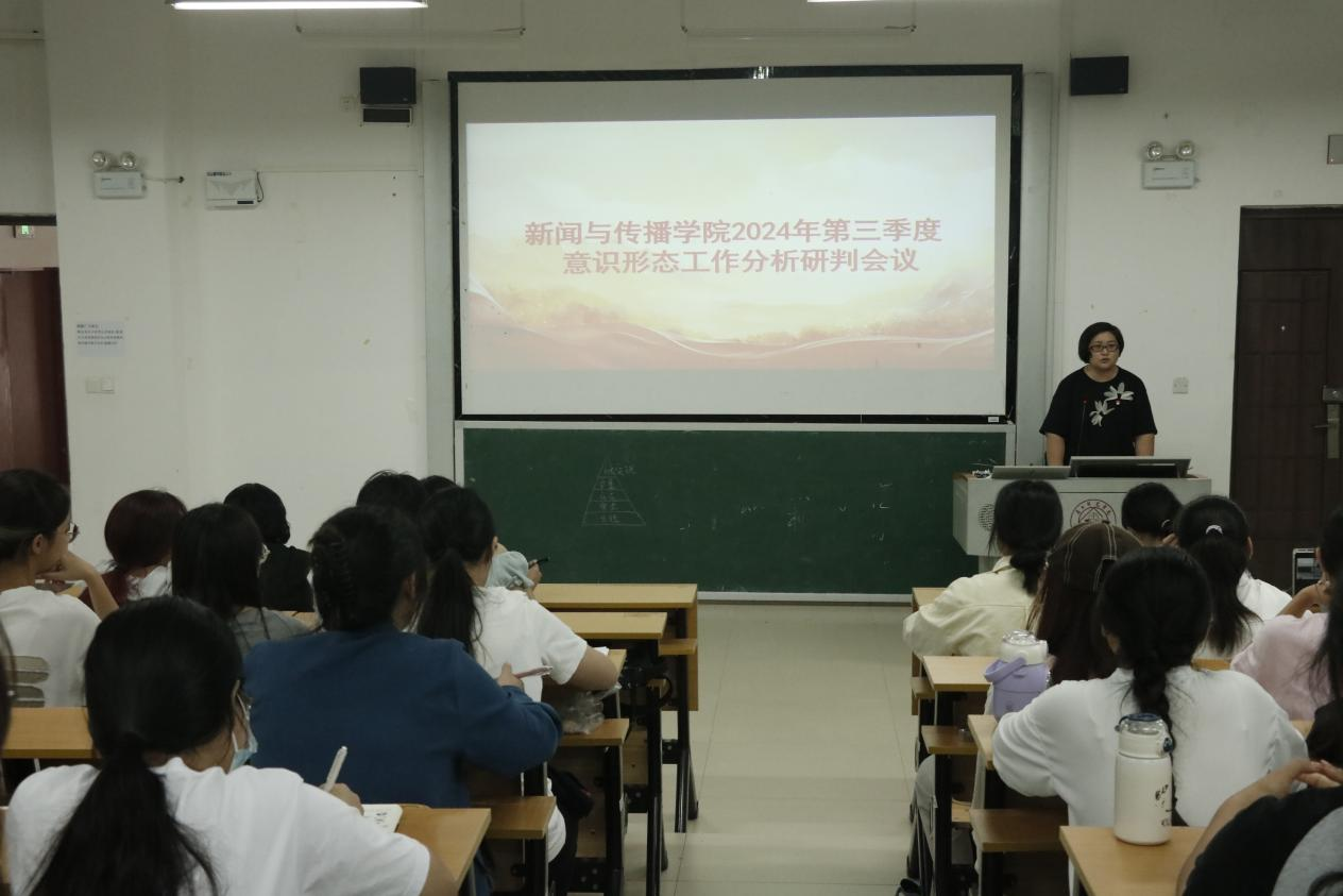 10 月 15 日中午,新闻与传播学院于文综楼 1013 室召开 2024 年第三季度意识形态工作分析研讨会。学院党委书记聂卉,党委副书记黄敏,各党支部书记、宣传委员,本硕各班团支书、宣传委员以及学院各平台部门负责人参加会议。