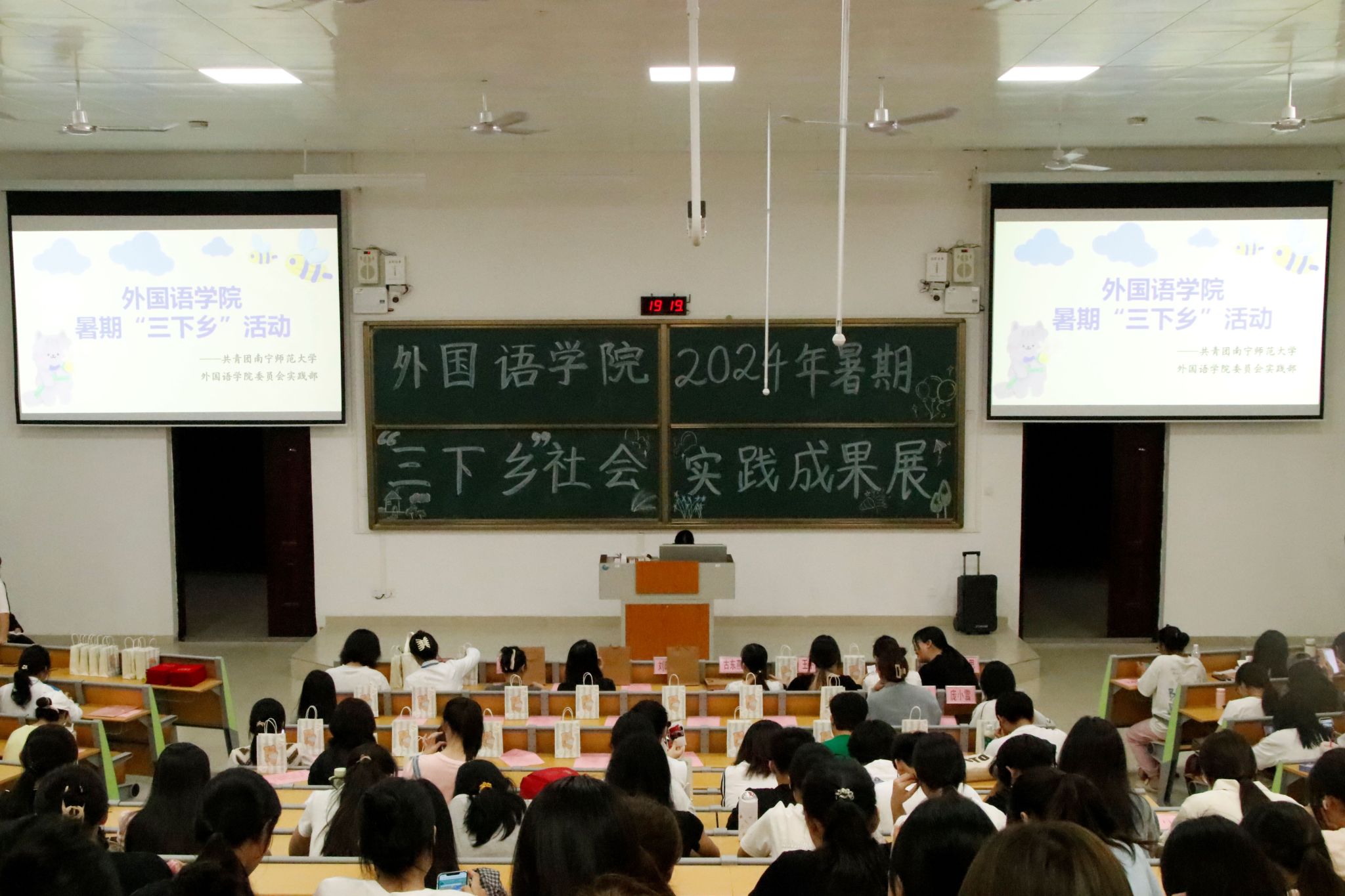 为提升同学们对暑期“三下乡”社会实践活动的认识,激发大学生对志愿服务活动的热情,外国语学院于10月16日晚在武鸣校区实验楼2A-105教室举办“星火接力传真情,丹心筑梦润沃土”为主题的2024年大学生暑期“三下乡”活动成果展。出席本次活动的有外国语学院党委副书记刘晖晖老师、学工办古东燕老师、黄慧梅老师、黄恬老师、院团委学生会团副主席团成员、武鸣校区各二级学院学生代表以及“三下乡”的志愿者和大一大二相关专业同学。