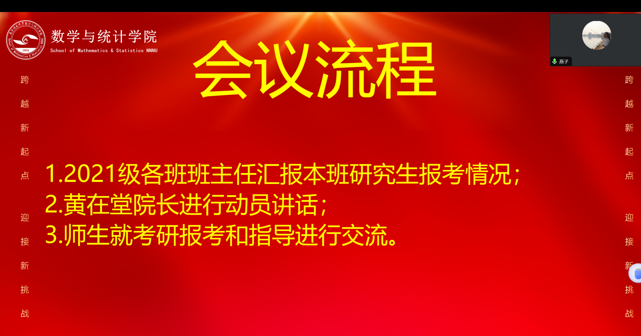 根据完美(中国)2025届本科毕业生考研深造工作推进会的会议精神,为高质量做好学院深造工作和就业创业工作,10月20日,数学与统计学院召开了2025年硕士研究生考试动员会,学院院长黄在堂、学院党委副书记付进、全体毕业年级班主任、毕业年级辅导员和全体2025届本科毕业生参加本次会议。因2025届本科毕业生目前正在实习,会议通过腾讯会议的方式在线上开展,会议由付进副书记主持。