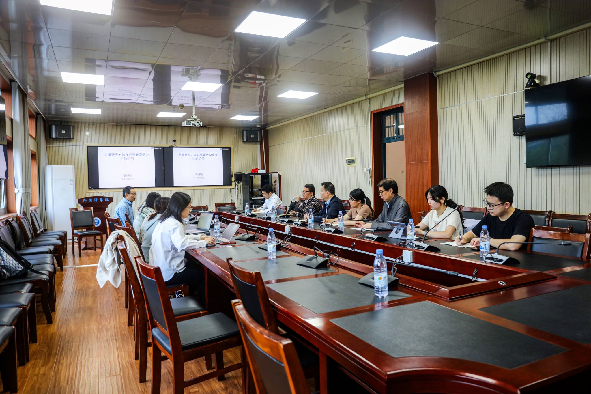 本次培训班特邀了华中师范大学秦晓晴教授和徐泉教授,他们分别为与会教师带来了关于教学研究方法和师范专业认证方面的精彩讲座。秦晓晴教授以“外语教学定量研究方法”为主题,深入浅出地构建了外语教学中的定量研究框架,并精准地指出了定量研究中的常见误区,为教师们提供了宝贵的指引。随后,徐泉教授围绕“多元化外语教育评价体系创新与实践——学生中心、产出导向的人才培养问题”这一主题,详细解析了英语师范专业认证的人才培养目标,并分享了华中师范大学在课程建设、教育评价等方面的先进经验,讲座结束后,秦教授与徐教授耐心解答了教师们提出的问题,展现出了高度的专业素养与热忱的教学态度,为此次参加培训的教师们拓宽了视野。