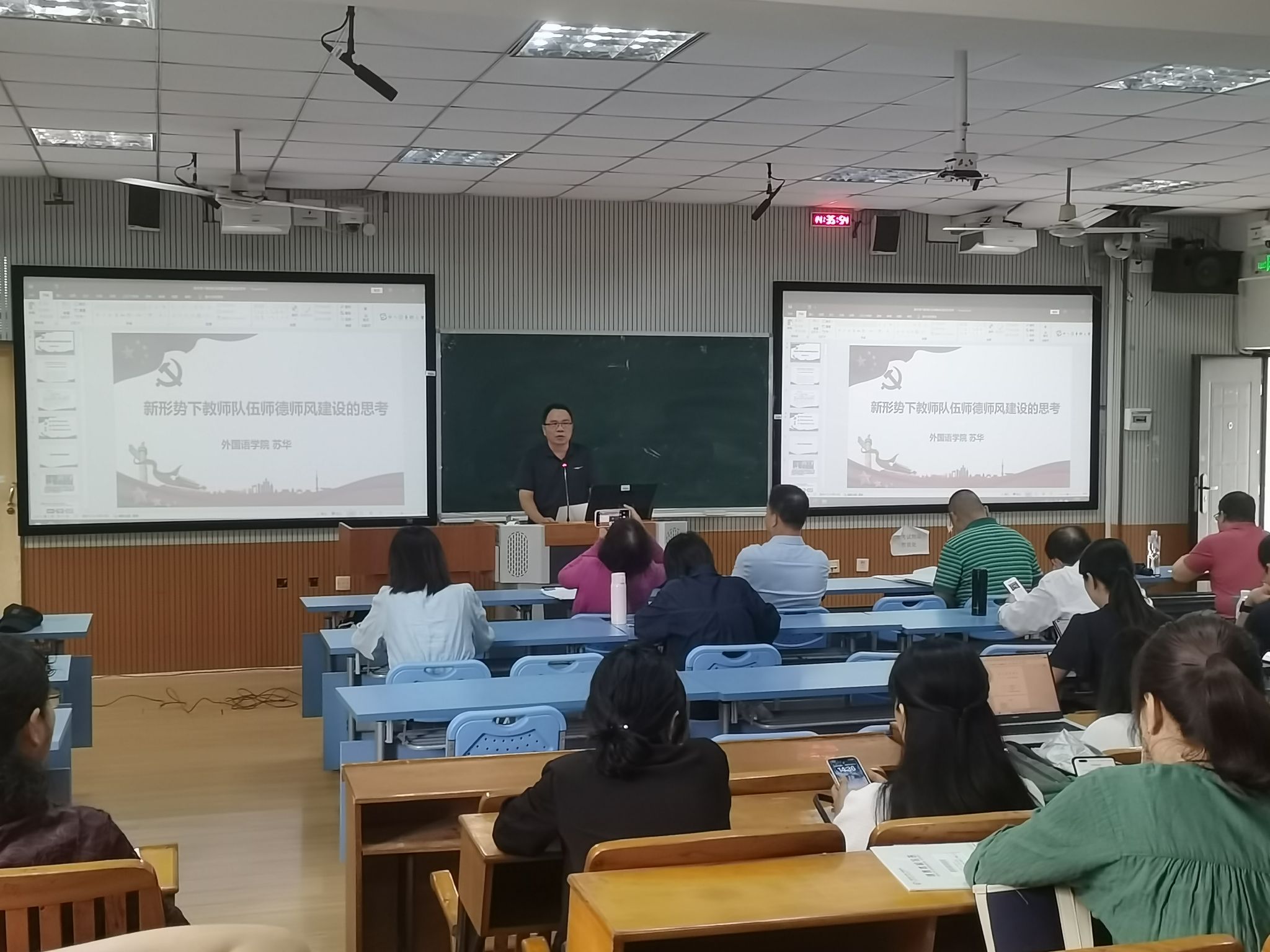 为持续推进师德师风建设,大力弘扬教育家精神,深入落实立德树人根本任务,10月15日下午,外国语学院在明秀校区召开了师德师风警示教育大会。会议由学院党委书记苏华主持,全院教职工参加。