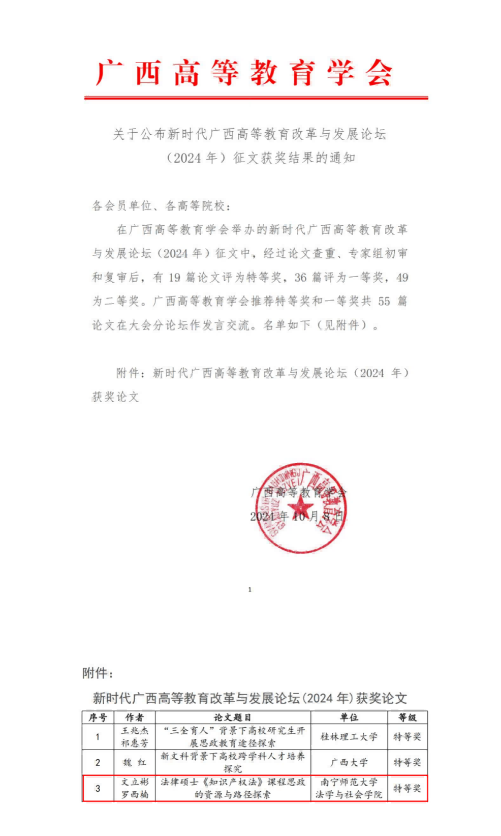为贯彻党的二十届三中全会精神和2024年全国教育大会精神,落实立德树人根本任务,扎实推进广西高等教育高质量发展,2024年10月26至27日,第三届新时代广西高等教育改革与发展论坛暨纪念广西高等教育学会成立40周年大会在北部湾大学召开。本次会议由广西壮族自治区教育厅指导举办,由广西高等教育学会主办,北部湾大学承办。本次会议有来自区内外200余位专家学者参与,法学与社会学院法律系师生受邀参加并作主题发言。