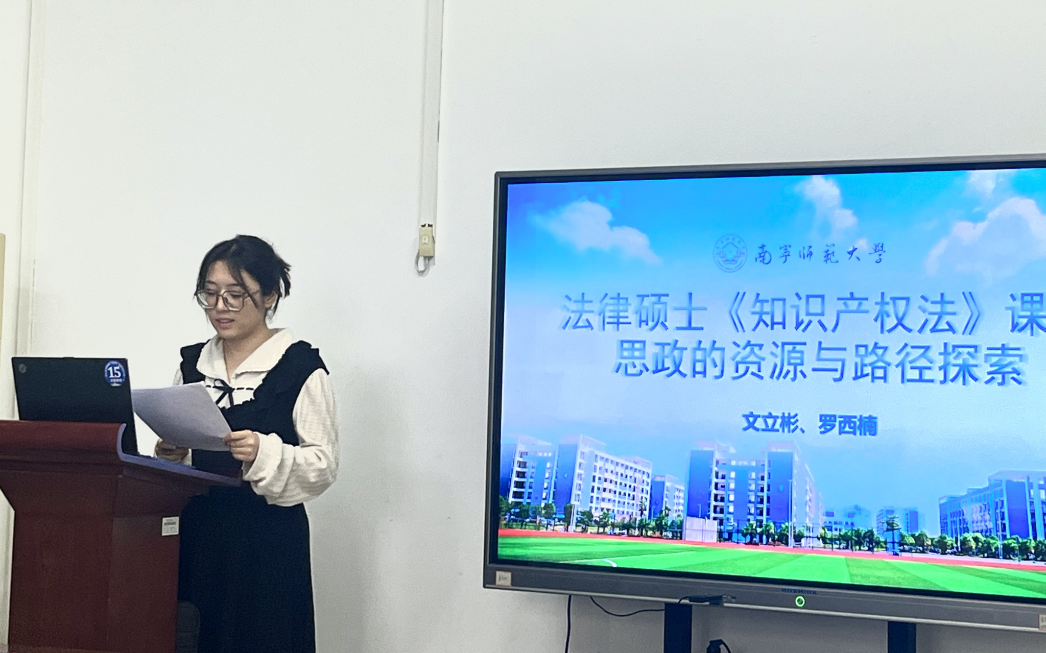 文立彬副教授和2022级法律硕士研究生罗西楠合著的论文《法律硕士知识产权法课程思政的资源与路径探索》被评为本次会议的特等奖。在主题发言环节,罗西楠分享了南宁师范大学《知识产权法》课程思政建设的经验。从课程资源看,应深入挖掘知识产权课程思政的丰富、独特内涵。一方面,挖掘知识产权规则变迁中的中国智慧和中国主张。另一方面,从知识产权法的实务经验和本土案例中挖掘思政元素,激发学生的爱国情怀,增强民族自豪感。从教学实践看,一要重视法律硕士专业学生的多重需求,即高阶的知识运用与道德素养,深度的理论与实践的融合,明确的法律职业导向。二是聚焦本地思政资源,深化思政元素的课程表达。三是重塑知识产权法课程思政教学评估体系,从评估指标、手段、多元主体重塑评估体系,以期推动法律硕士知识产权法课程向纵深发展。