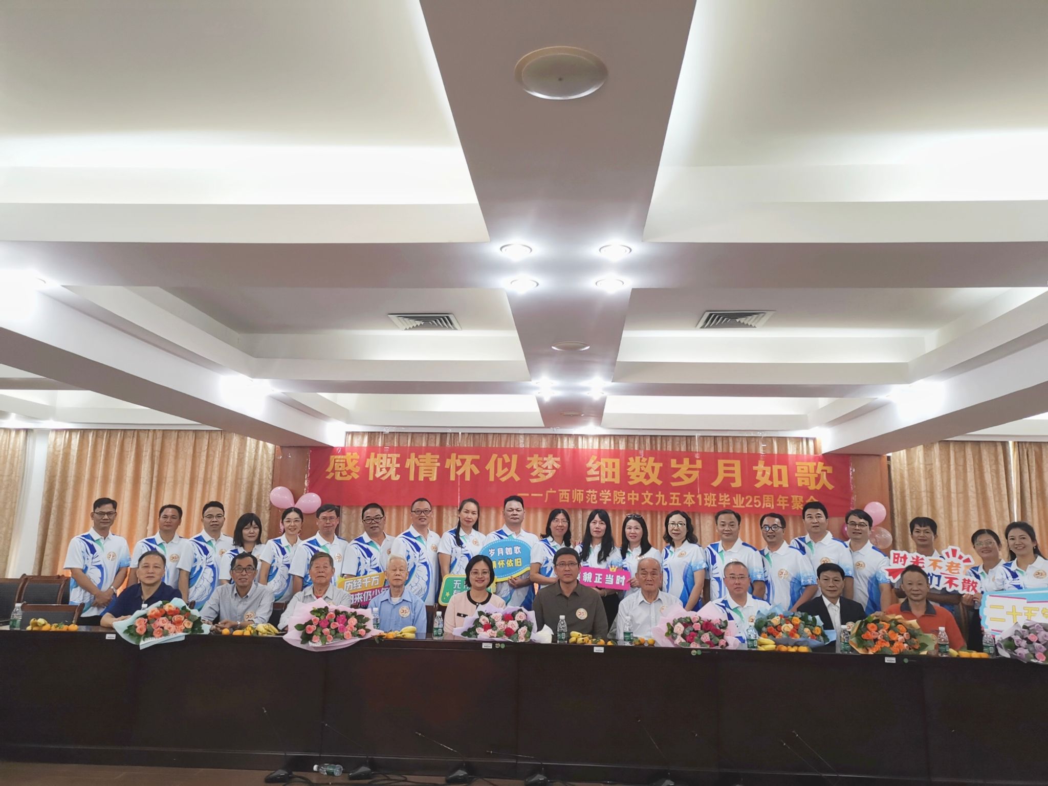 10月26日上午,南宁师范大学中文系95级本科1班同学回到母校,在他们当年发奋读书、青春有为的明秀校区鸿远楼409会议室举行以“感慨情怀似梦,细数岁月如歌”为主题的毕业25周年纪念活动。文学院党委书记旷晓霞、院长石勇和当年专业授课教师江业国教授、吴隐林教授、王光荣教授、施平教授、李福灼教授、宾恩海教授、李志元教授、何玉嘉老师等应邀参加座谈会。座谈会由该班班长、我校来宾校友办常务副主任、柳州地区民族高级中学党委书记邓东锋主持。
