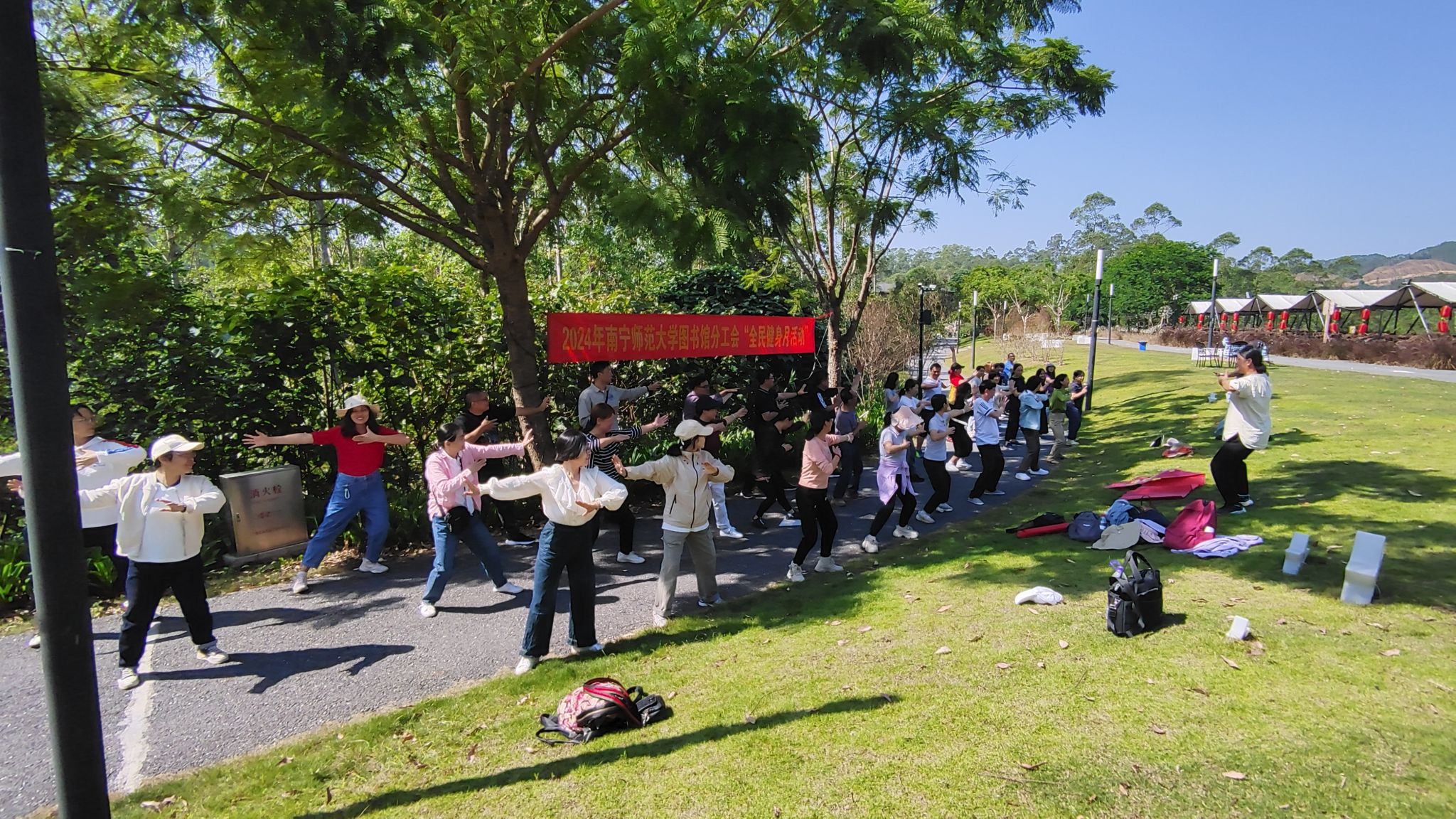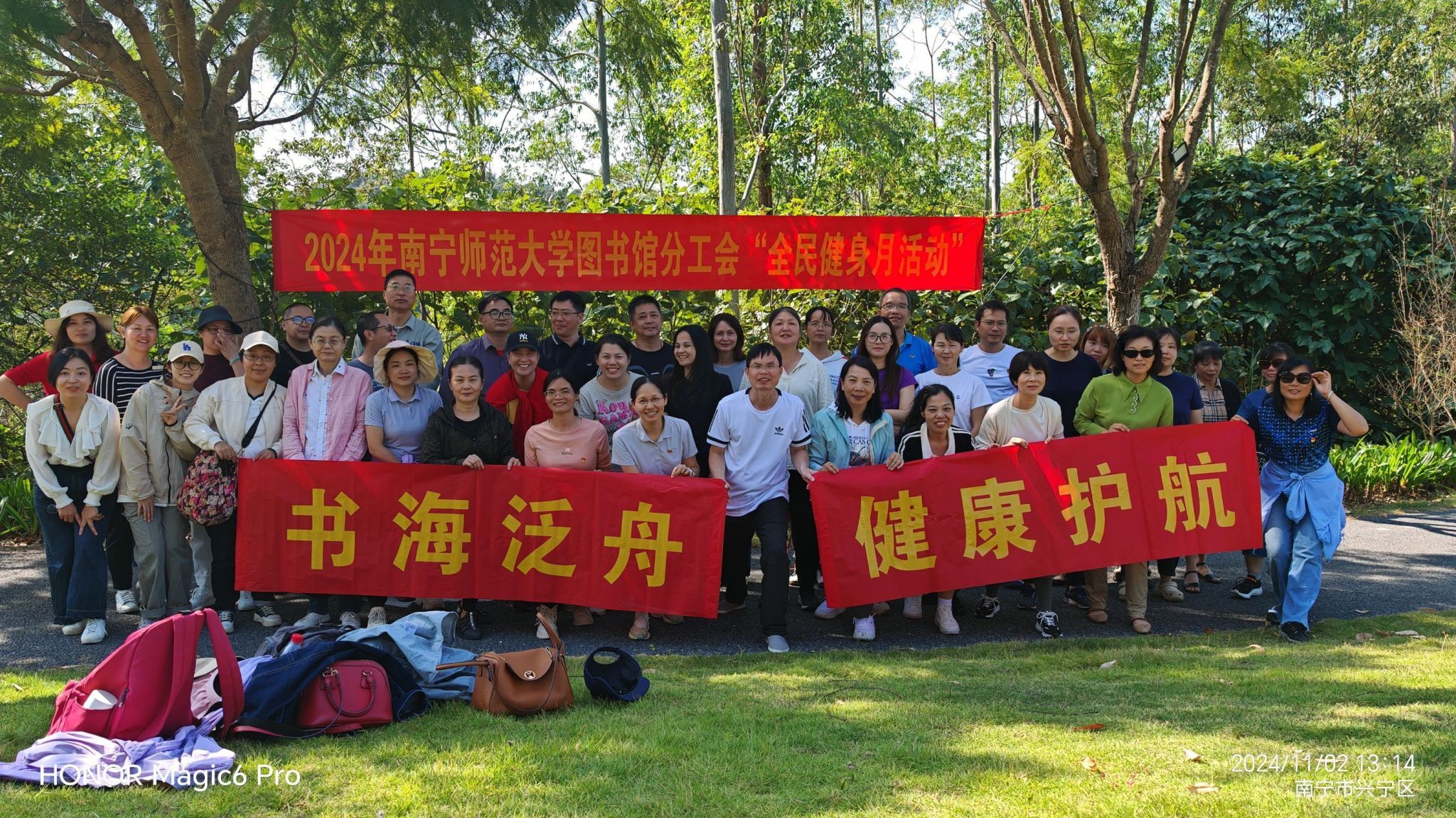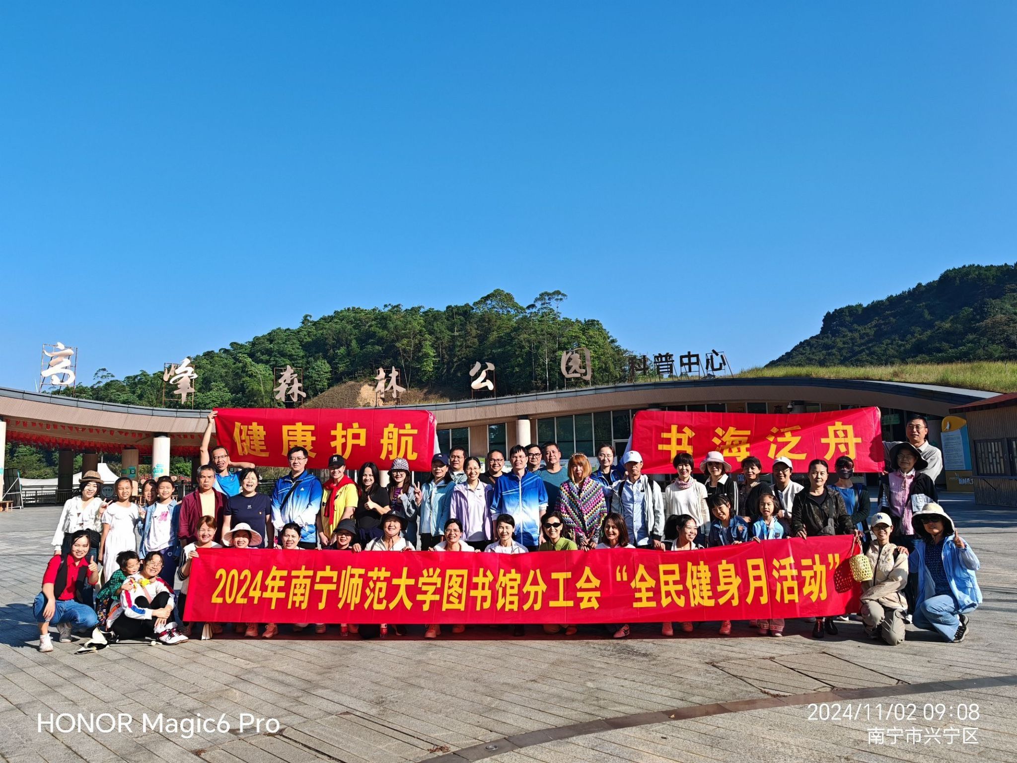 为了继续巩固全民健身月的活动效果,丰富馆员的业余生活,11月2日,图书馆全体馆员到广西高峰森林公园开展了主题为“书海泛舟,健康护航”的“全民健身月”暨分工会秋游活动,共有40余名馆员参与。活动期间,馆员们开展了生命河谷健步走、八段锦集体操练、棋牌竞技等健身活动,现场气氛轻松愉悦。此外,图书馆全体党员还参观了广西高峰林场党性教育基地,开展了党性教育学习活动。