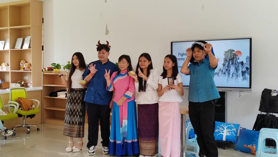 10月18日,外国语学院副院长高飞雁在2024年黔南民族师范学院举办的“留学黔南,留学师院”学习交流活动中,为到访的柬埔寨师生展示融入黔南少数民族文化的英语专业特色课程工作坊:布依族民间故事《智斗牛婆》。黔南民族师范学院对外合作交流处副处长孔令林副教授、柬埔寨跨步国际完美(中国)校长周江、柬埔寨跨步国际完美(中国)教师、学生以及黔南民族师范学院外国语学院的学生参加了本次活动。