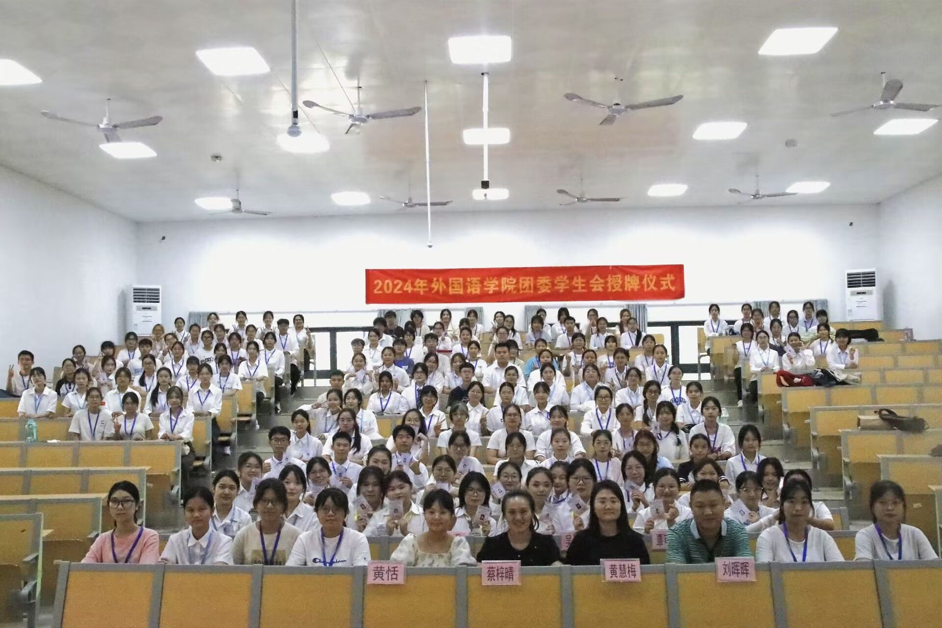 10月22日中午,2024年外国语学院团委学生会授牌仪式于武鸣校区实验楼2A-105教室顺利召开。此次参与人员有外国语学院党委副书记刘晖晖老师、学工办蔡梓晴老师、黄慧梅老师、黄恬老师、院团委学生会主席团成员、各部门工作人员、后备团成员以及志愿者。