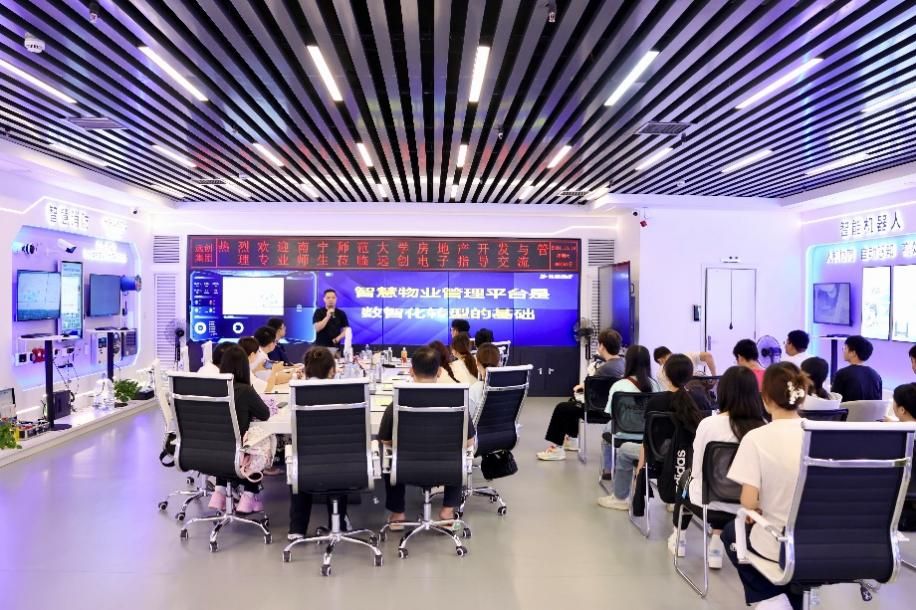 在广西远创电子科技有限公司,该公司董事长韦春龙详细介绍了安消一体化全域智控中心平台,技术人员通过现场模拟、实操演示展示物业智能化设备及解决方案,让现场师生体验了数智化物业服务的场景,加深了师生对智慧城市建设和安消一体化的系统认识。针对同学们提出疑问,韦春龙一一进行了耐心解答。娄信强主任和黄乐老师一同对远创公司的热情接待表示感谢,并期待未来能与公司达成校企合作,深入交流。
