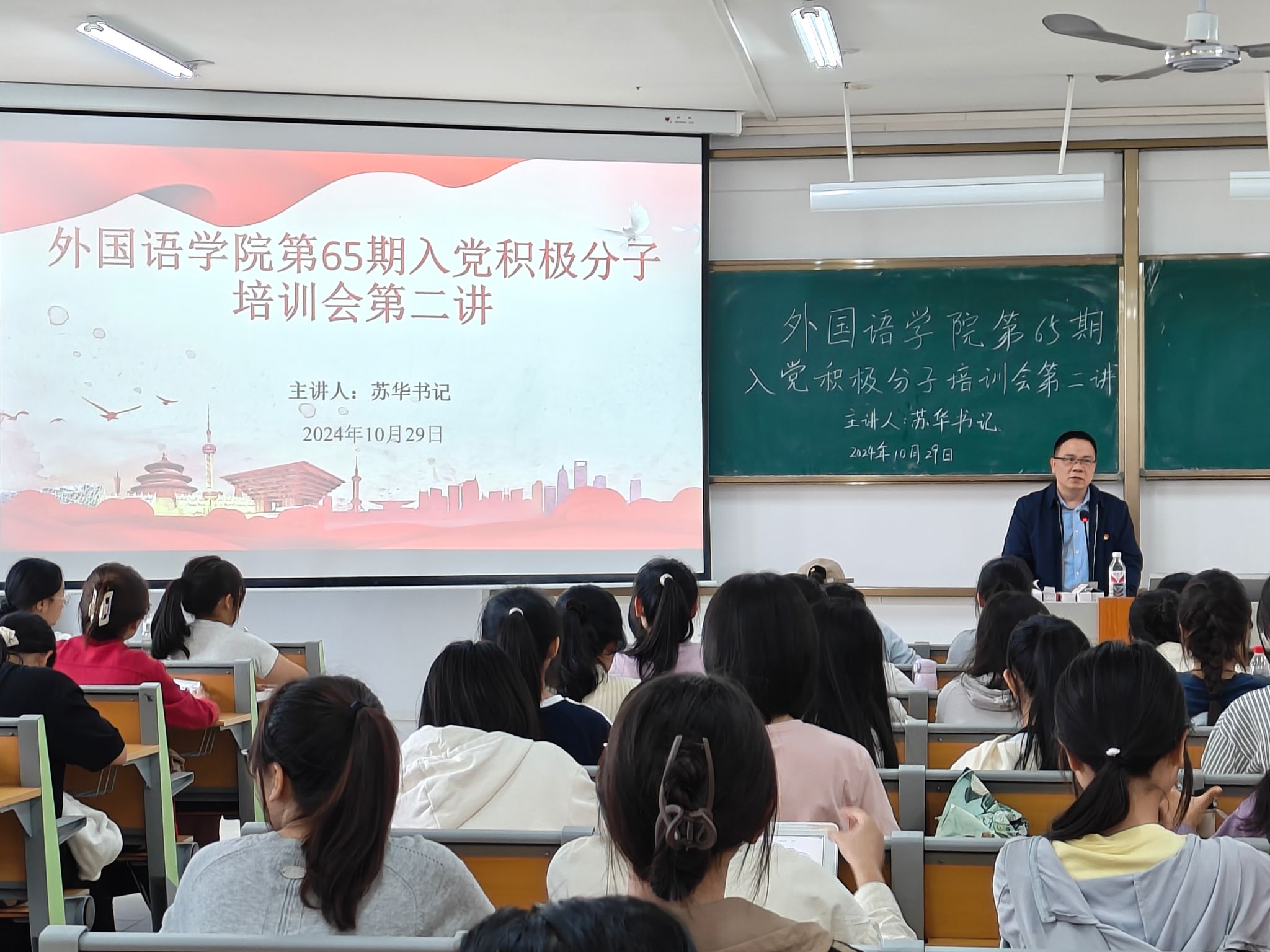 10月29日下午,外国语学院党委在实验楼2A-502举办了第65期入党积极分子培训会第二讲。本次培训会主题为“中国共产党人的精神谱系”。由外国语学院党委书记苏华主讲,本学期认定的125名入党积极分子参加了此次培训。