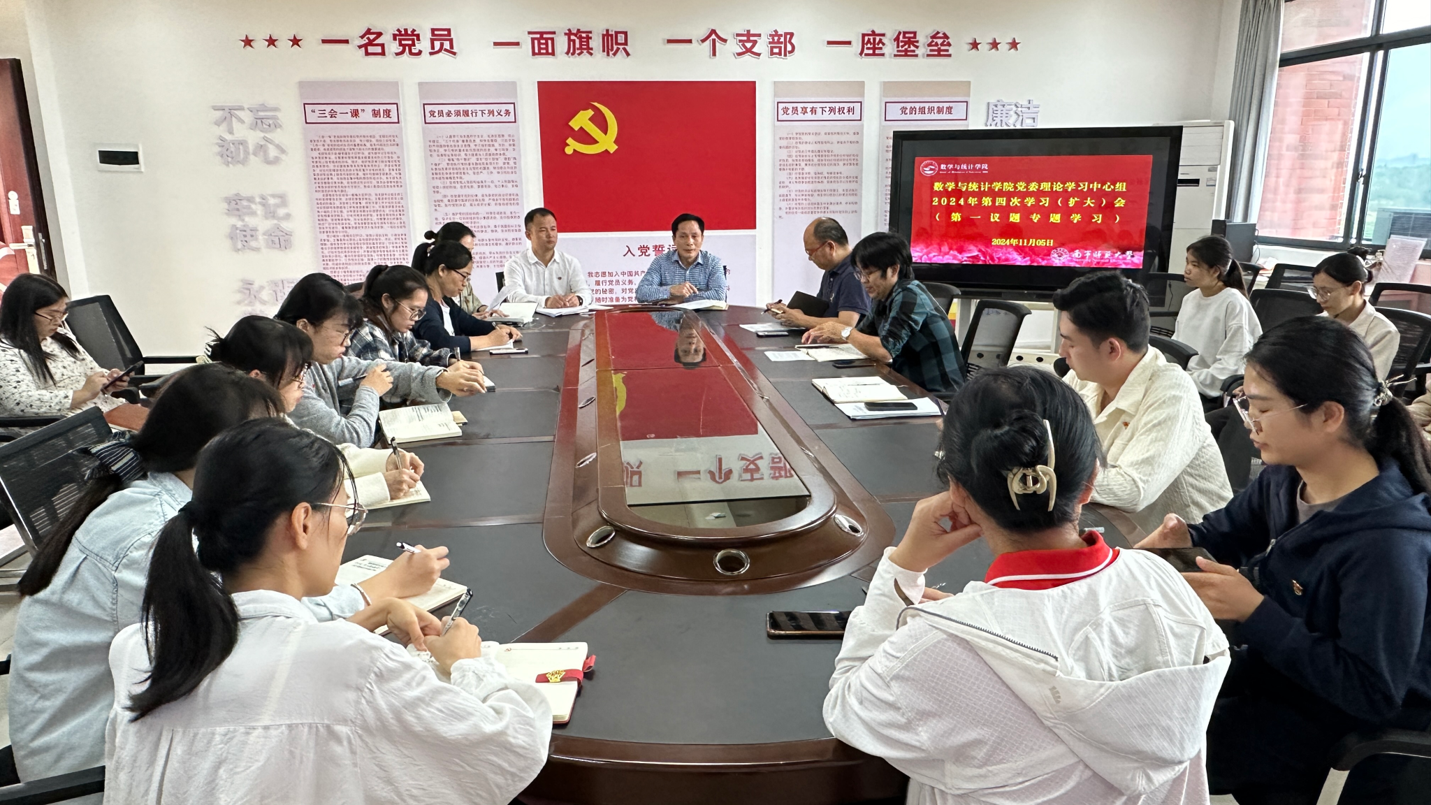 11月6日下午,数学与统计学院党委理论学习中心组在武鸣校区数统楼A501党员活动室召开2024年第四次学习(扩大)会,学院党委理论学习中心组成员、办公室主任、学生党支部书记及支委参加会议,会议由学院党委书记余敢才主持。