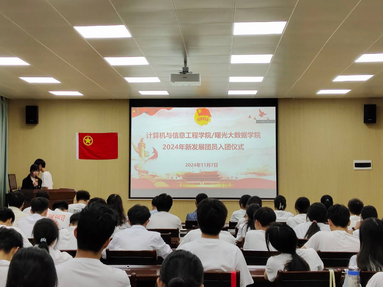 为深入学习贯彻习近平新时代中国特色社会主义思想,深入贯彻习近平总书记关于青年工作的重要思想,践行党、团、队一体化培养体系要求,激励广大团员青年坚定理想信念,11月7日,计算机与信息工程学院/曙光大数据学院团委在地信楼A301教室举办了2024年新发展团员入团仪式。参加本次活动的有学院团委书记宋宏斌、学院辅导员许艺静、黄海泳、团委组织部全体成员、新发展团员及其所在团支部团员代表。