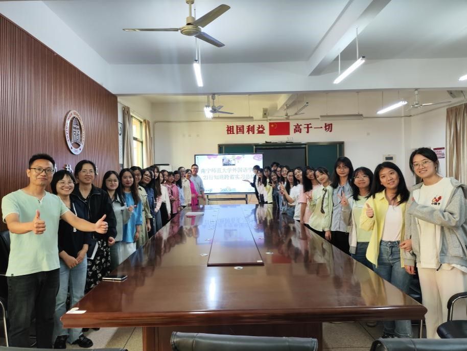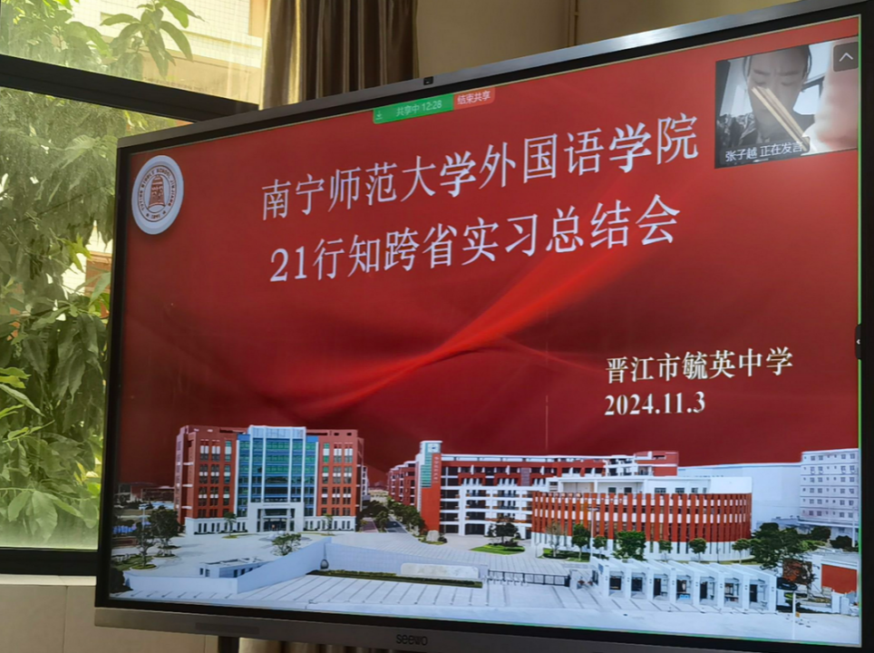 2024年11月4日上午10点,毓英中学组织召开了南宁师范大学外国语学院21行知班跨省实习线上线下总结会。本次会议由毓英中学的教务处主任张子越老师主持,高一高二的年级备课组长以及一众英语教学指导老师、英语专业21级陶行知实验班全体同学出席了此次会议,我院教师教育教研室主任林绍丽也在线参加了本次总结会。在总结会中,实习生们展示了自己的实习成果,和指导老师们一起共同回顾一个月以来的交流,通过这一次会议总结经验,为未来的教育事业做好铺垫。