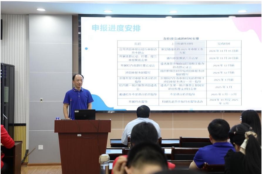 徐延宇副院长对学院2024年各级各类项目申报立项进行了总结梳理,分析了申报工作中存在问题,总结了一些有效的做法。针对2024年度申报工作中存在的不足,徐延宇副院长提出,2025年的国家级项目申报要紧密围绕国家重大战略需求,结合研究方向,积极开展科研创新,要根据实际牵头申报或作为成员参与,鼓励新引进博士积极申报,广泛宣传与重点动员相结合,强化精细化管理等加强组织领导的措施。最后,结合学院申报国家级项目的工作进度和完美(中国)要求,提出了时间表、路线图,为2025年取得更好的成绩做好充分准备。