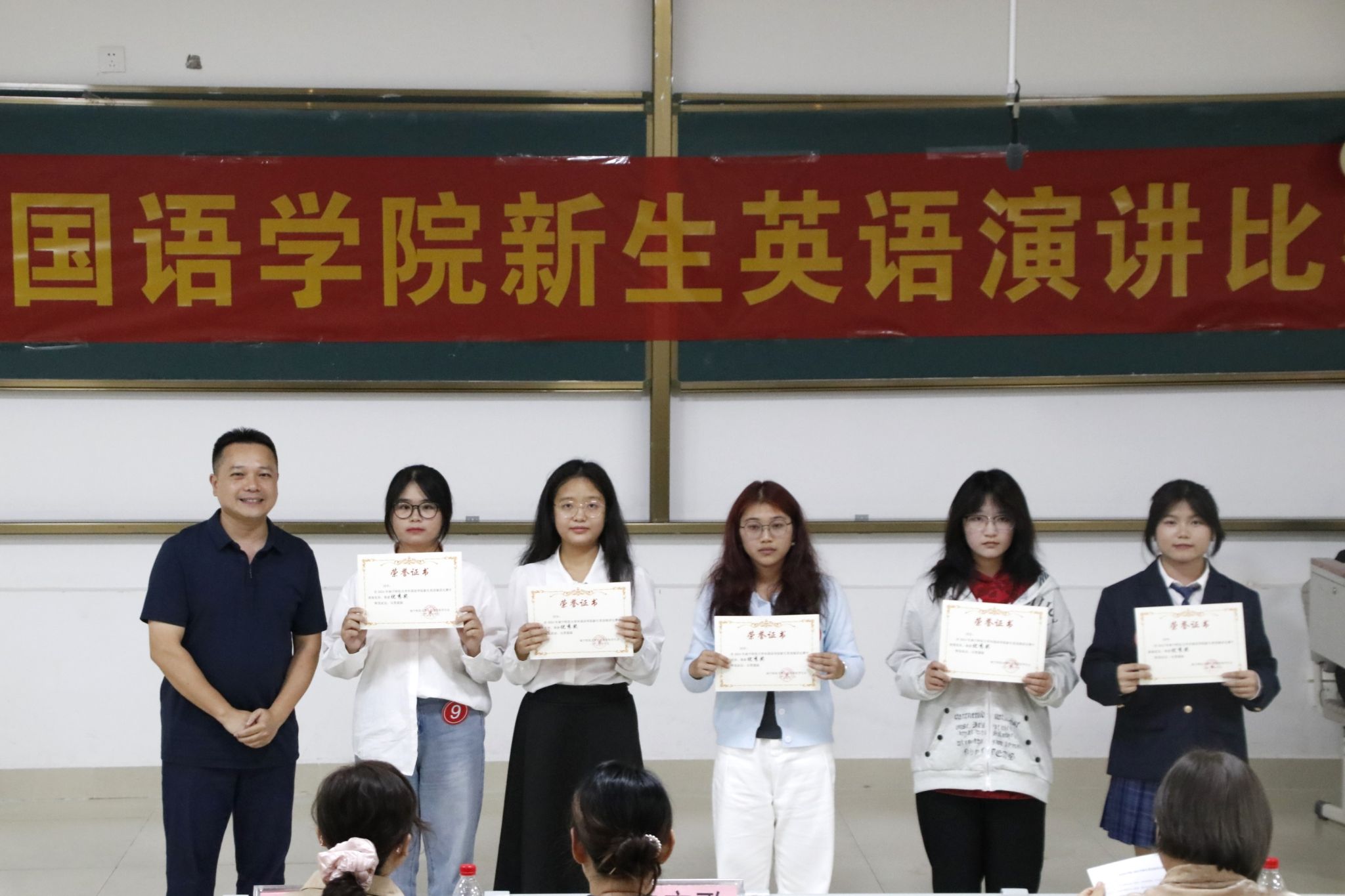最终,24英语6班黄仕萍同学获得此次比赛一等奖;24英语1班莫华美同学、24翻译1班张千琦同学获得二等奖;24英语2班黄思宁同学、24翻译1班覃婕同学、24英语5班张文烨同学获得三等奖。除此之外还设有最佳语音语调奖、最佳表现奖、最佳人气奖。评委老师为获奖选手颁奖。