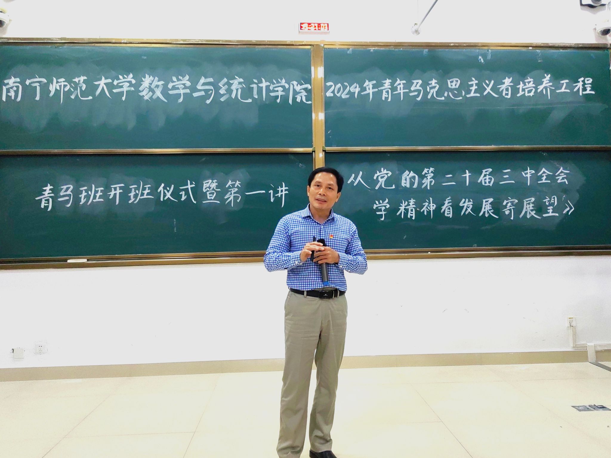 为培养坚定的青年马克思主义者、提高青年学子的思想政治素养,11月11日,数学与统计学院在武鸣校区武2-209教室开展2024年青年马克思主义者培养工程青马班开班仪式暨第一讲《从党的二十届三中全会学精神、看发展、寄展望》。学院党委书记余敢才参加开班仪式并授课,学院团委书记,辅导员及教师代表参加活动。