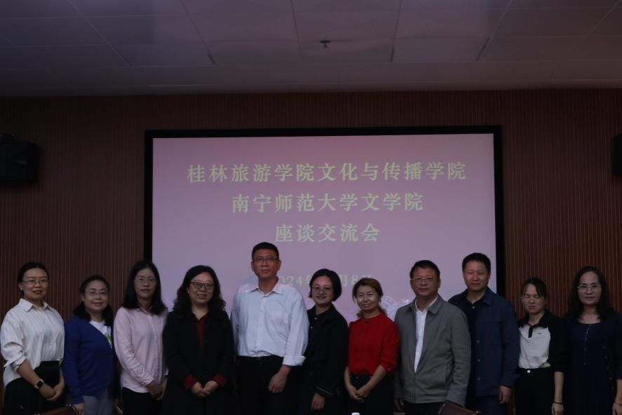 为加强两院之间的学术合作,共同探讨专业建设、教学实践、科研服务等领域的创新与发展,11月8日上午,桂林旅游学院文化与传播学院院长刘爱萍、副院长谢金娇、汉语国际教育教研室主任白雪、汉语言文学教研室主任李钰等一行4人到我校文学院进行座谈交流。文学院党委书记旷晓霞、院长石勇、副院长林安宁、中国现当代文学教研室主任王俊、语言学教研室主任韦露选等人热情接待了刘爱萍一行,文学院全体行政人员陪同调研交流。