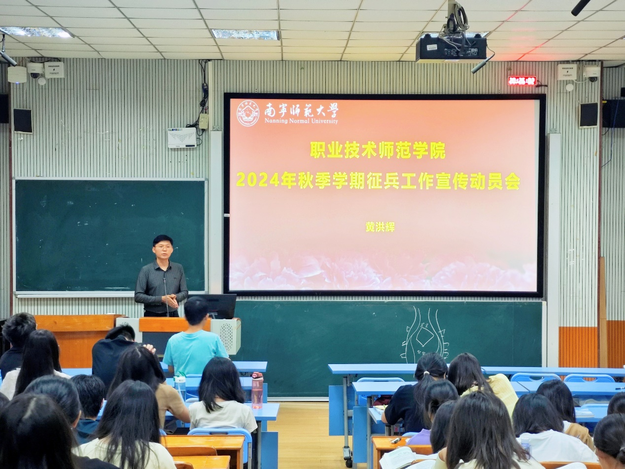 为响应国家号召,加强征兵政策宣传,11月18日晚上,职业技术师范学院在明秀校区文星楼110教室召开了2024年征兵政策宣讲会。24级全体学生参加会议。
