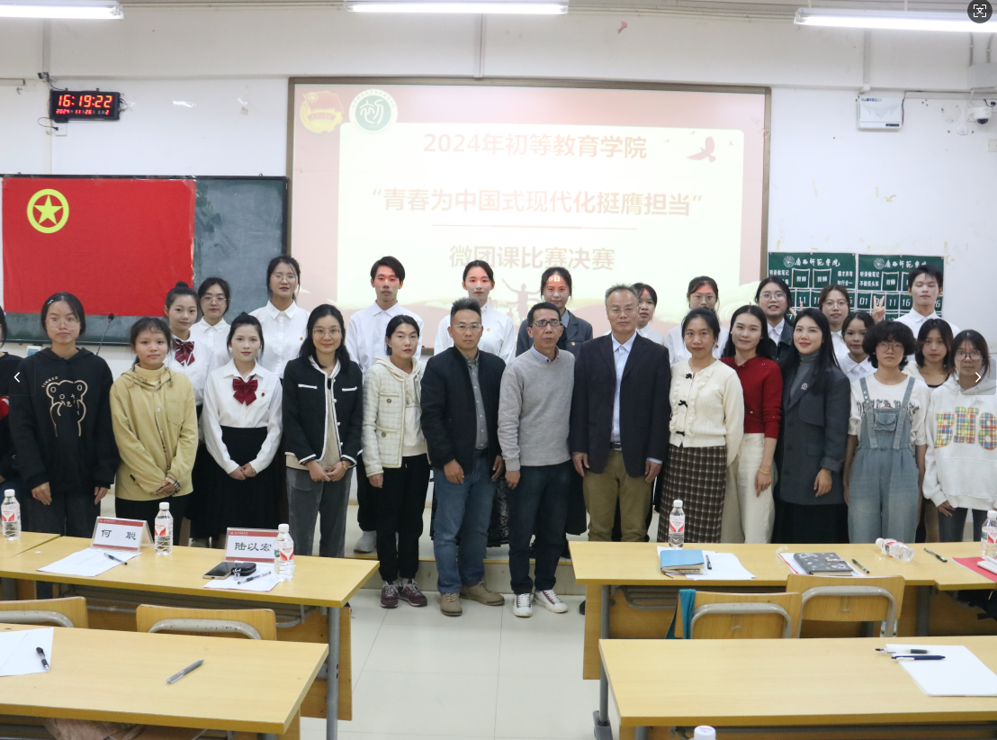 11月26日下午,初等教育学院在五合校区五综108教室举办“青春为中国式现代化挺膺担当”主题“微团课”比赛。初等教育学院党委书记陆以宏、党委副书记苏学权以及党委组织员何聪到比赛现场指导,学院团委书记李欣等5位辅导员担任评委。