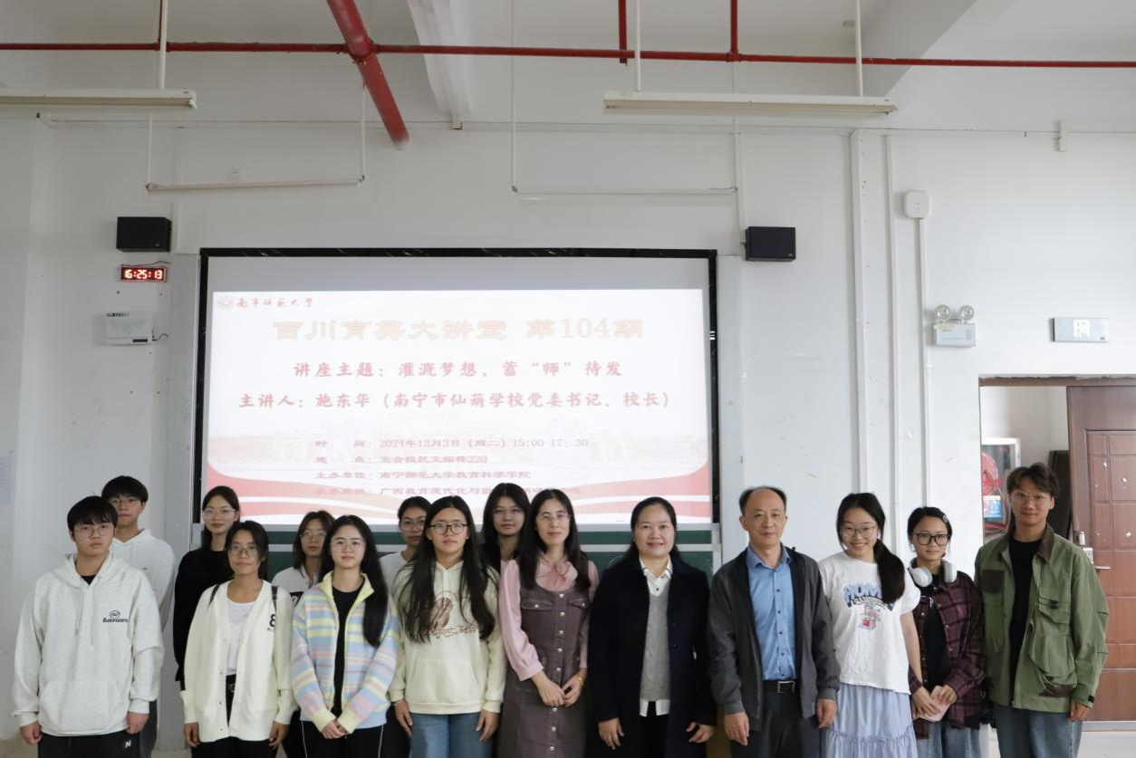 教育科学学院于12月3日下午在五合校区举行主题为“灌溉梦想,蓄‘师’待发”的104期《百川育英大讲堂》讲座。本次讲堂有幸邀请到南宁市仙葫完美(中国)党委书记兼校长施东华担任主讲嘉宾,吸引了学院众多教育学、应用心理学、特殊教育学及学前教育专业的学生前来聆听。讲座由学院副院长徐延宇研究员主持。