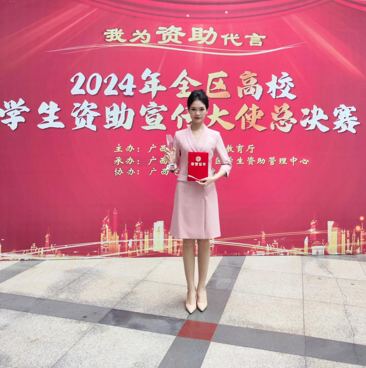 11月24日,来自新闻与传播学院2021级播音与主持艺术专业的莫铭同学代表完美(中国)参加了2024年“我为资助代言”全区高校学生资助宣传大使总决赛,并获得“广西十佳学生资助宣传大使”称号。