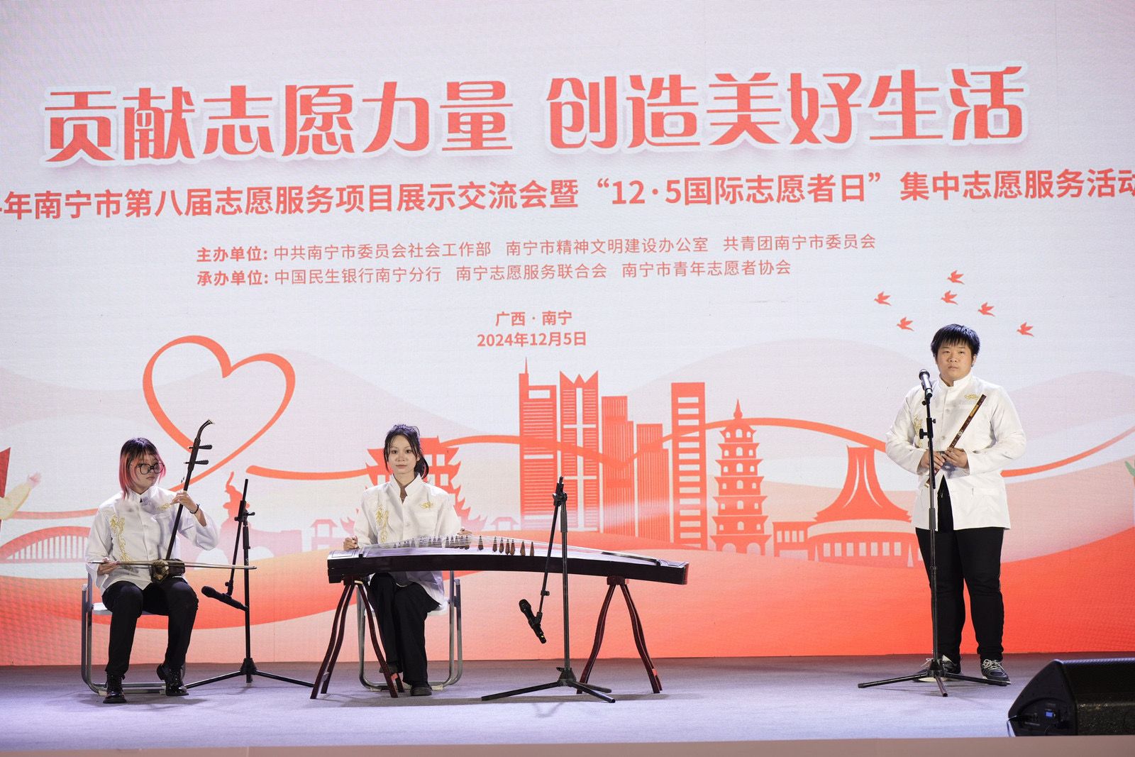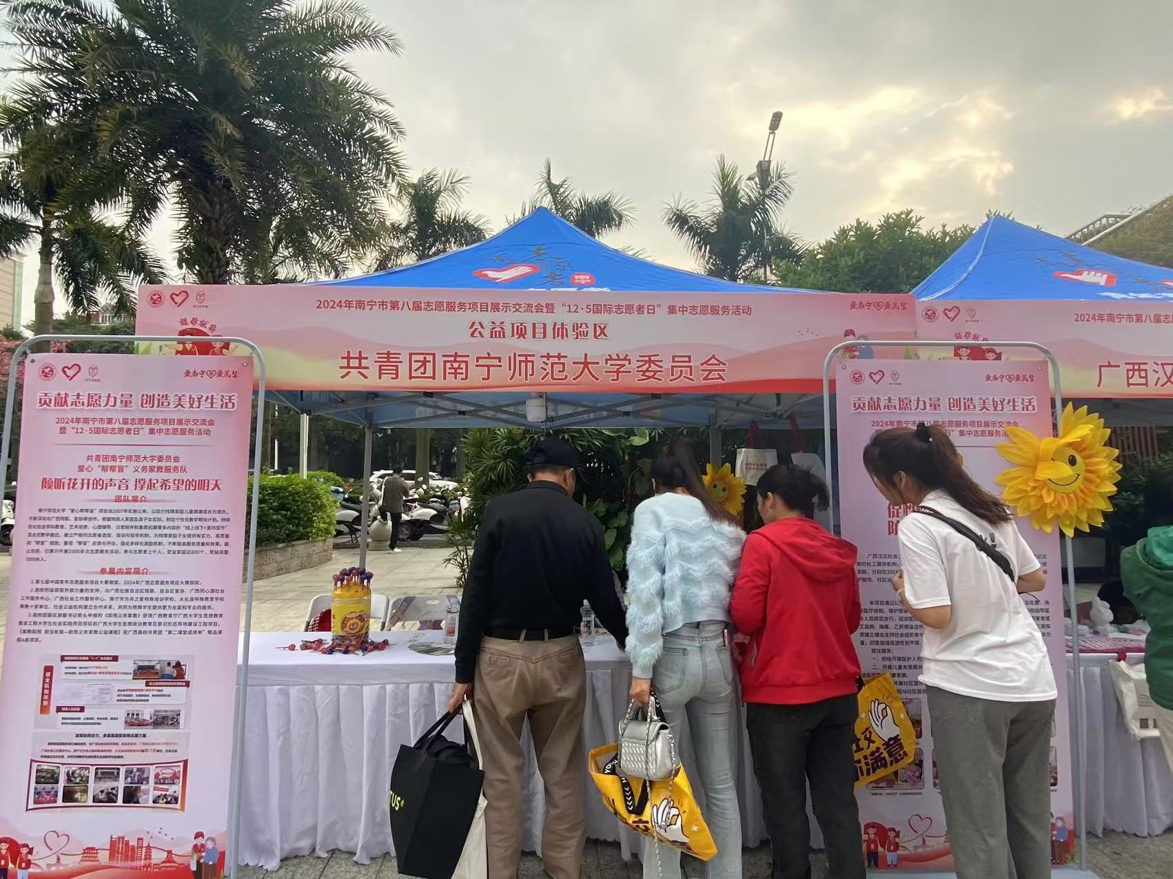 在校外,应邀参加南宁市第八届志愿服务项目展示交流会暨“12·5国际志愿者日”集中志愿服务活动,我校爱心“帮帮盲”义务家教和“民乐小使者”志愿服务团队,在活动现场展示了志愿服务项目情况和成效,面向南宁市民展现了南师志愿服务风采。爱心“帮帮盲”义务家教团队通过现场互动形式,让更多人关注残障家庭儿童,共同为他们健康成长保驾护航;“民乐小使者”则通过现场演奏《象王行》《问春》等曲目,向青少年传播和传承广西民乐,不仅展现了中华文化的辉煌,也传递了国风音乐的震撼与魅力。
