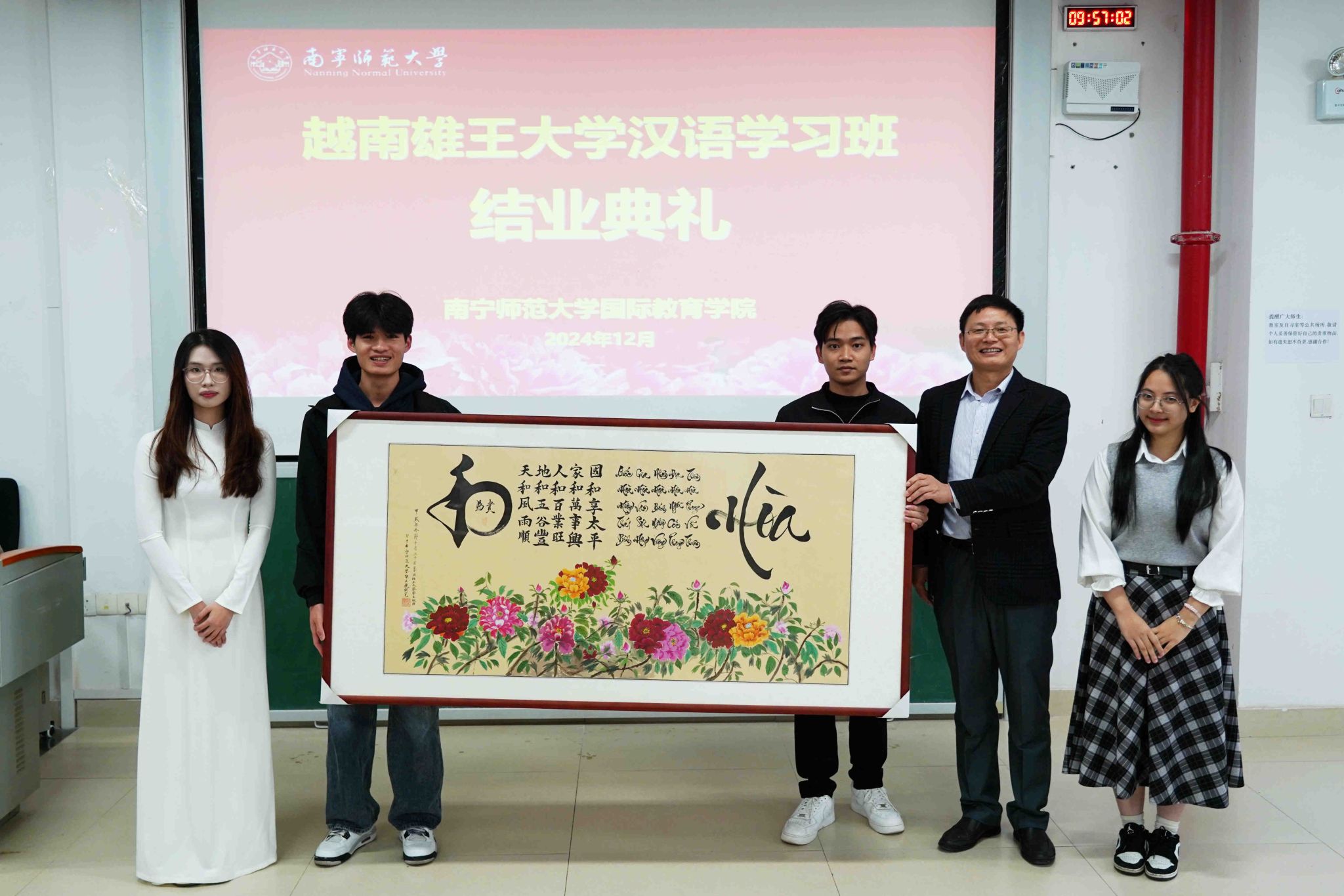 在典礼上,越南留学生向国际教育学院赠送了自己的书画作品,以此表达对学院的感谢和留念。这些作品充满了浓厚的越南文化特色,展示了学员们的艺术才华和创造力,也为学院增添了更多的国际文化元素。