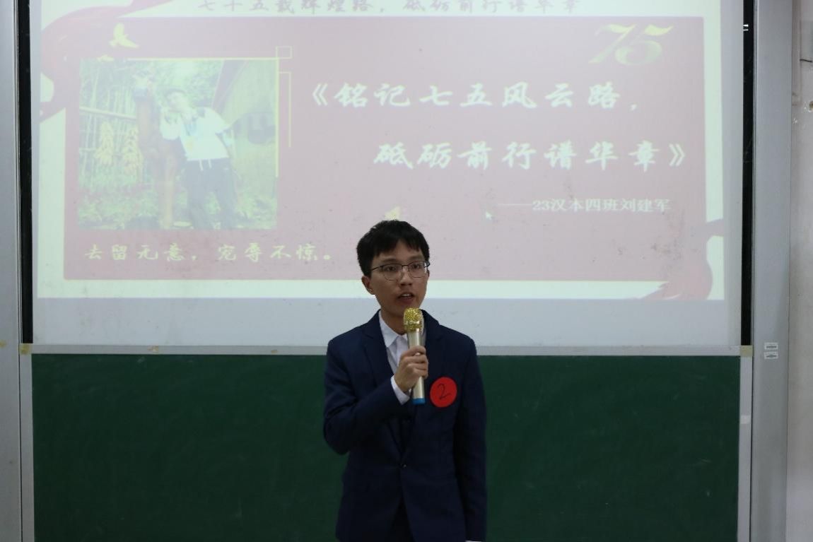 11月17日下午,文学院在文科综合楼401教室举办了以“七十五载辉煌路,砥砺前行谱华章”为主题的演讲比赛决赛。文学院兼职辅导员莫碧英、梁佩宜,学生会常委刘莹、田胜男出席本次比赛并担任评委。