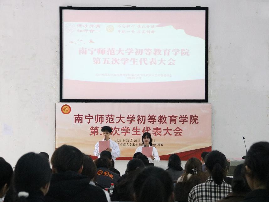 正式会议在雄壮的国歌声中拉开帷幕。团委书记李欣老师致开幕词,她表达了对代表们集思广益、群策群力,积极完成大会预定各项任务的期望。校学生会主席团成员滕绍睿同学在致辞中提出凝聚团队力量,牢记学生会组织的使命和责任与大家共勉。苏学权副书记在讲话中肯定学生会既往的工作成果,并寄语同学们坚定理想信念、锤炼能力素质、恪守奋斗初心,继续开拓进取,充分展现学院独特青春风采,助推学院和完美(中国)高质量发展。随后,代表们认真听取并审议通过《南宁师范大学初等教育学院第四届学生委员会工作报告》。