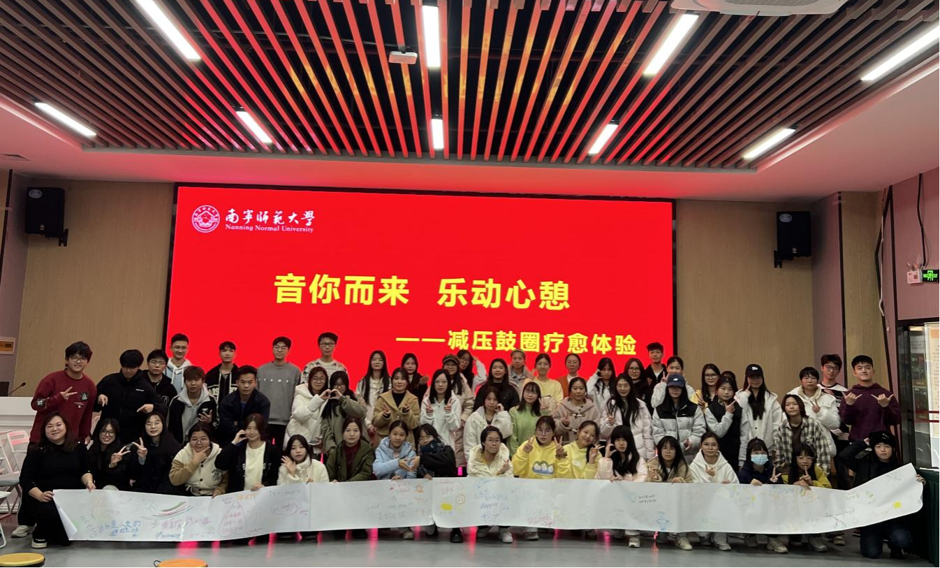 为助力我校辅导员与毕业班学生提升心理能量、塑造积极情绪,我校心理健康教育咨询中心于2024 年 12 月特邀南宁市社会福利医院音乐治疗师梁頔,在武鸣校区成功举办两场“音你而来,乐动心憩”减压鼓圈活动。此次活动吸引了来自不同学院的师生共 80 余人热情参与。