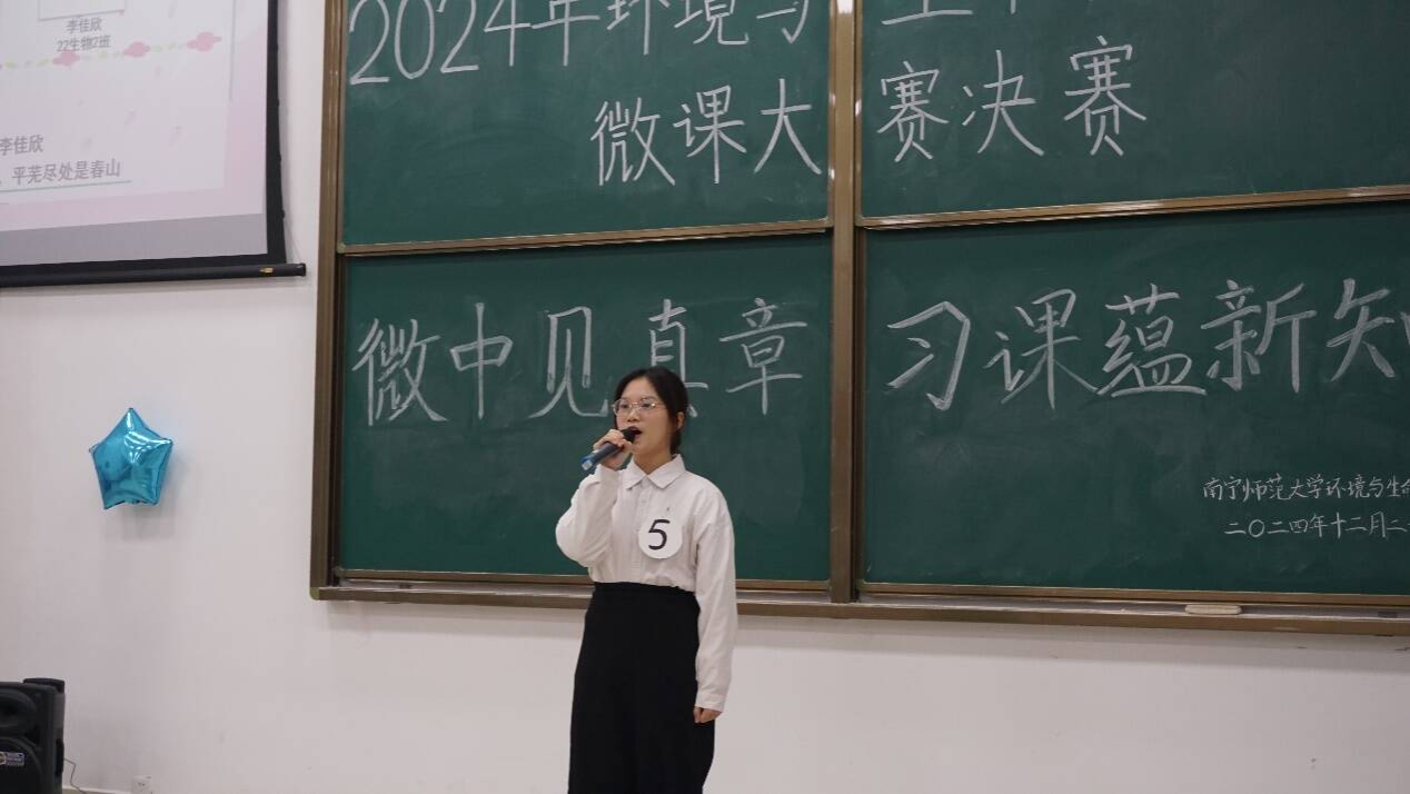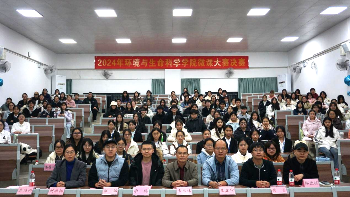 为激发学生们的创新活力,提升教学技能与信息技术应用能力,促进优质教育资源的共享与传播,环境与生命科学学院于12月24日晚在武鸣校区地海楼B109教室举办了“微中见真章,习课蕴新知”微课大赛决赛。本次大赛邀请到学院党委副书记(主持党委工作)韦东林,专任教师王鑫宇、黄富、张拓、李鹏、郄亚栋,团委书记刘雅楠、辅导员龚炜婷,兼职辅导员莫馨媛、聂燕担任评委,此外,各二级学院代表以及学院主席团成员也出席了本次大赛。