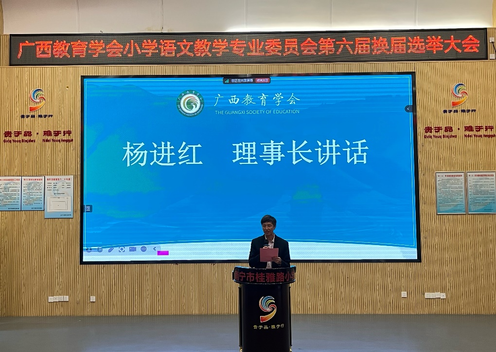 专委会新一届理事长杨进红发表讲话。杨进红代表新一届理事会,对上一届理事会工作给予了高度的评价,向一直以来关心和支持广西小语会工作的各级领导、专家学者以及广西小语届同仁表示最诚挚的感谢。针对新一届理事会的工作愿景,他建议聚焦以下四个方面去思考与探索:一是持续增强广西小语会的凝聚力和影响力,打破区域、校际壁垒,形成合力,聚焦专题,孵化成果,打造具有广西本土特色的小学语文教学与研究共同体;二是以新课标、新教材、新评价的改革创新为抓手,通过组织学习研讨会,提升小语教师应用新技术、新方法、新思维的素养;三是进一步拓展学术交流的渠道,通过举办年会、研讨会、论坛等学术活动,促进会员之间的交流与合作,扩大教师的工作圈与学术圈;四是搭建教师专业成长的“立交桥”,组织教育教学研究活动,推动小语教师走专业发展之路,提升教师队伍的整体素质。