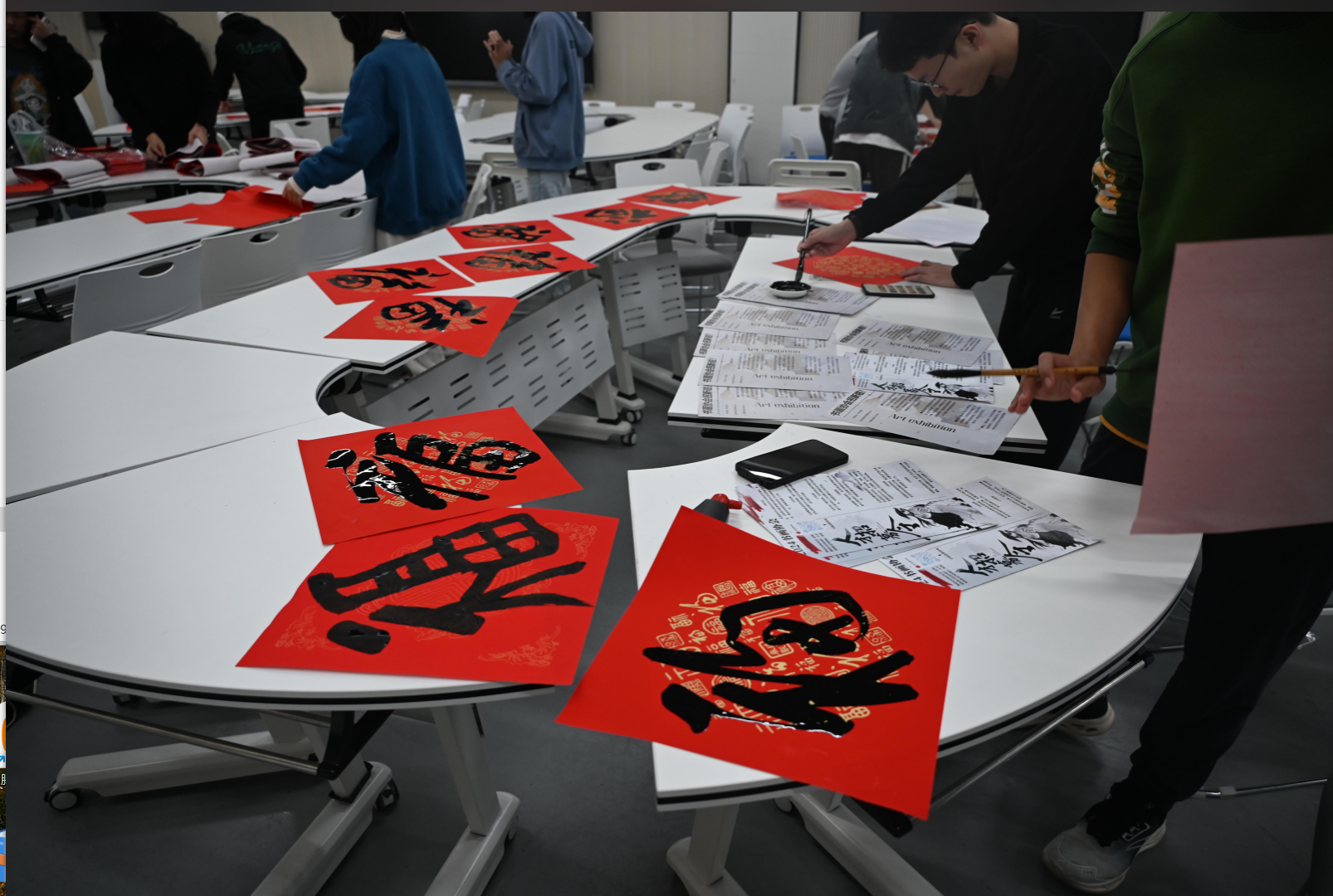 活动现场热闹无比,书香与墨香交织,营造出浓厚的节日氛围。书画协会的同学们早早地来到现场,书写一幅幅寓意吉祥、翰墨飘香的春联。这些春联内容广泛,既有传统的祝福词句,如“岁岁平安福寿多,年年顺景财源广”,也有富有创意的现代词句,如“智慧如星照学海,才华似月映文林”。每一副春联都承载着书画协会成员对老师同学们的美好祝愿和深情厚意。