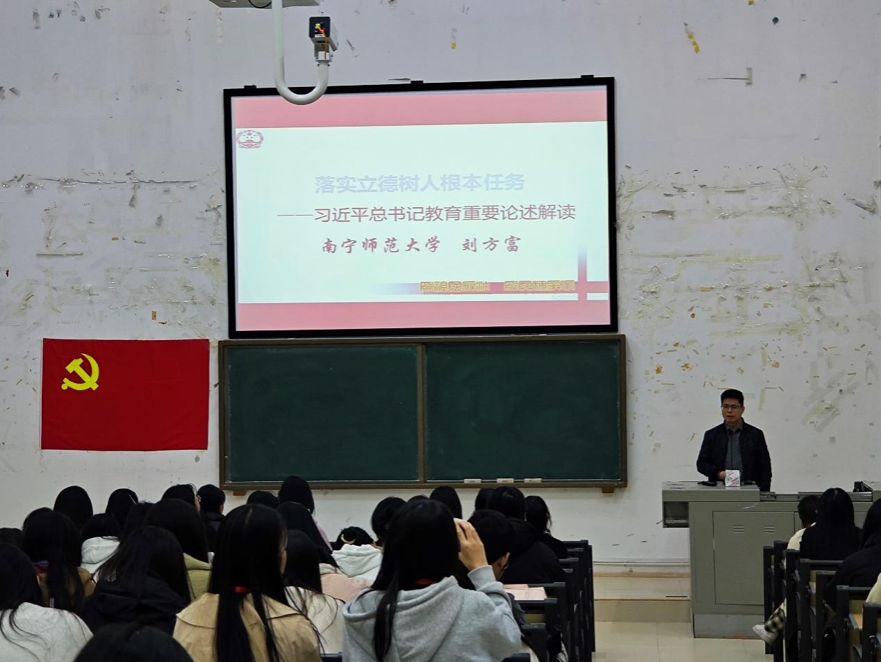 在第三讲课中,刘方富教授以落实立德树人根本任务为主题-习近平总书记教育重要论述解读,围绕什么是素养、培养什么人、立什么德及如何立德树人等方面进行论述。他指出教育改革要从问题出发,要树立多样化的人才管理体系,更要致力于德智体美劳全面发展。刘教授将习近平总书记教育重要论述归纳为四个方面:一个核心、两翼驱动、三个抓手、四个保障,启示我们应树立正确的价值观,做“四有”好老师。