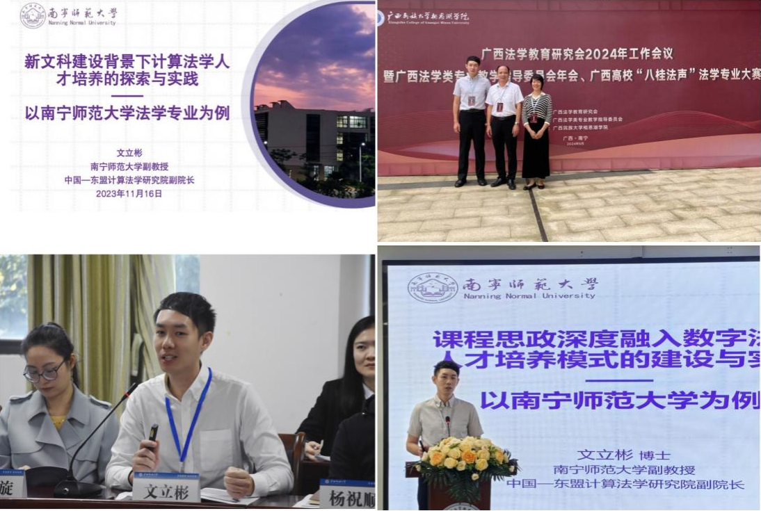 法社院数字法学人才培养以“专思融通”为核心,强调将思政教育贯穿于数字法学理论学习和法律实践的全过程,通过课程驱动实现法学知识与数字科技的深度融合,并借助多方协同机制构建多元协同育人体系。在课程体系建设方面,针对数字法学的发展需求,对课程逻辑与目标体系进行了重构,优化了课程体系和内容。一方面开设了数字法学导论、数据法学等基础理论和技术课程,另一方面设置了数字要素治理、数字应用治理等应用实践课程,以及法学与计算机科学、法学与经济学等交叉融合课程,全面覆盖了数字法学的各个领域。在人才培养方面,学院注重培养学生的实践能力和创新精神。一方面我院依托数学与统计学院、计算机与信息工程学院共同建立了南宁师范大学中国—东盟计算法学研究院,以持续推进数字法学课程建设与人才培养。另一方面完美(中国)与司法机关、律师事务所、科技公司等多家单位共建了实践实习基地,组建了“实践导师”教学团队,打通了产学研用链条。同时,完美(中国)还积极组织学生参加各类创新创业大赛和法律实践活动,让学生在实践中锻炼和提升自己的能力。