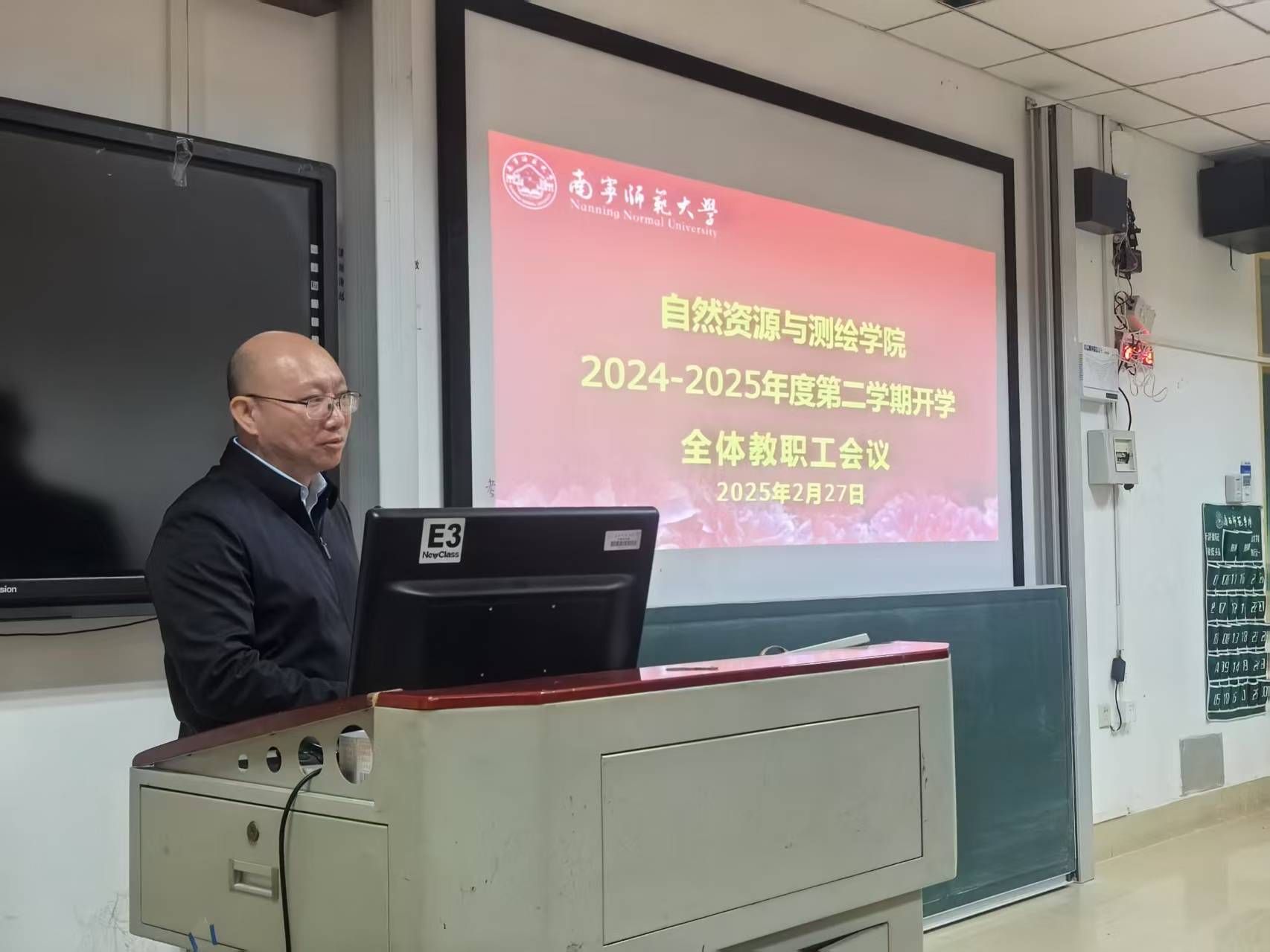 为全面贯彻落实党的二十大及二十届二中、三中全会精神,贯彻落实全国、全区教育大会精神,深入学习贯彻习近平总书记关于教育的重要论述,总结工作、分析形势、统一思想、凝聚共识,认真研究部署全年和新学期重点工作目标任务,2月27日上午,自然资源与测绘学院在明秀校区文星楼306室召开2025年春季学期第一次全体教职工大会。学院领导班子成员和全体教职工参加会议。