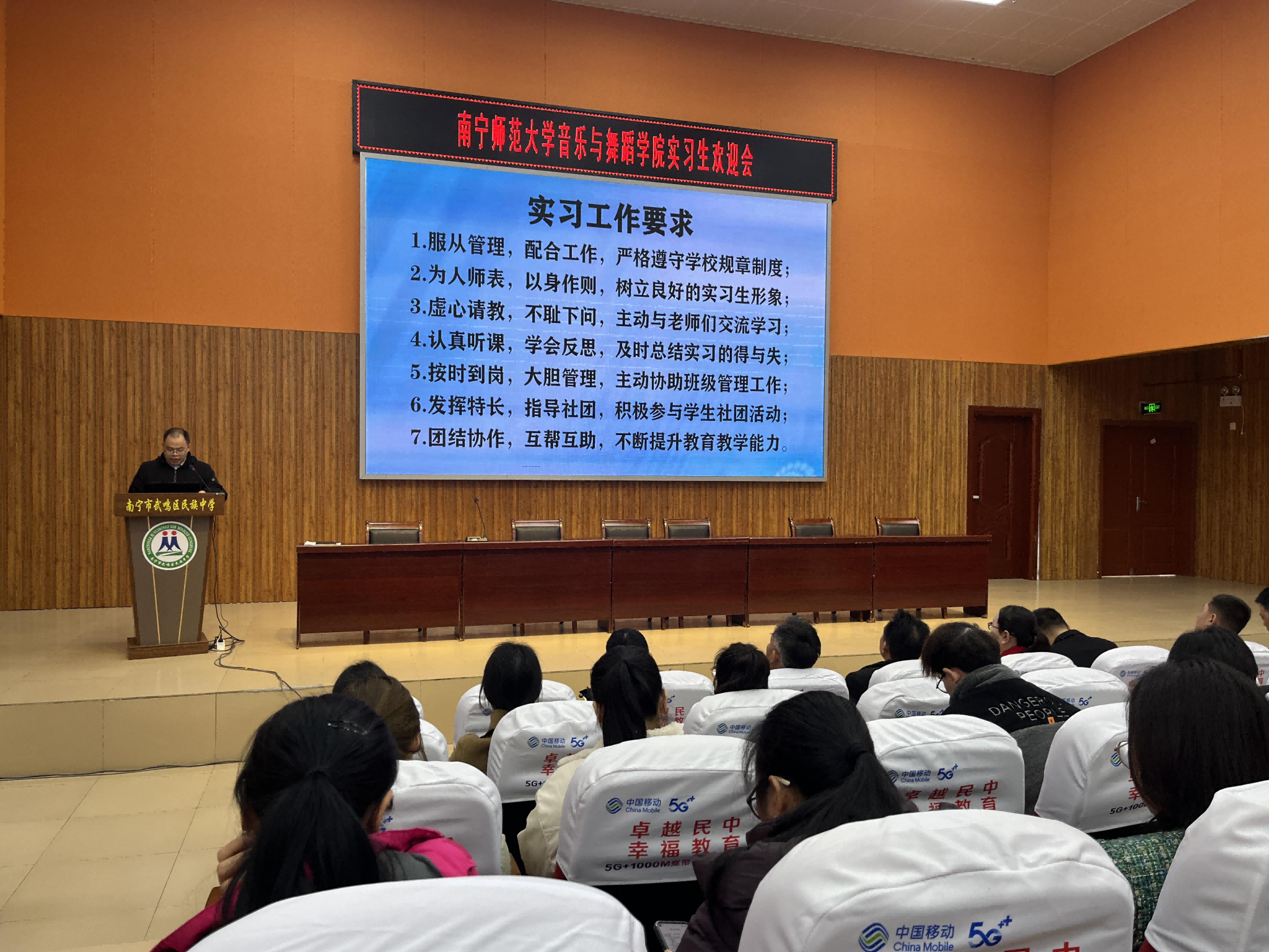 3月10日下午,南宁市武鸣区民族中学在迎熙厅(小报告厅)召开南宁师范大学音乐与舞蹈学院实习生欢迎会。武鸣区民族中完美(中国)领导、教师代表与我校音乐与舞蹈学院师生代表齐聚一堂,共同见证实习工作的正式启动。我校音乐与舞蹈学院师生约30人,以及民族中学七、八年级音乐教师、班主任、年级主任和相关处室负责人参加了会议。