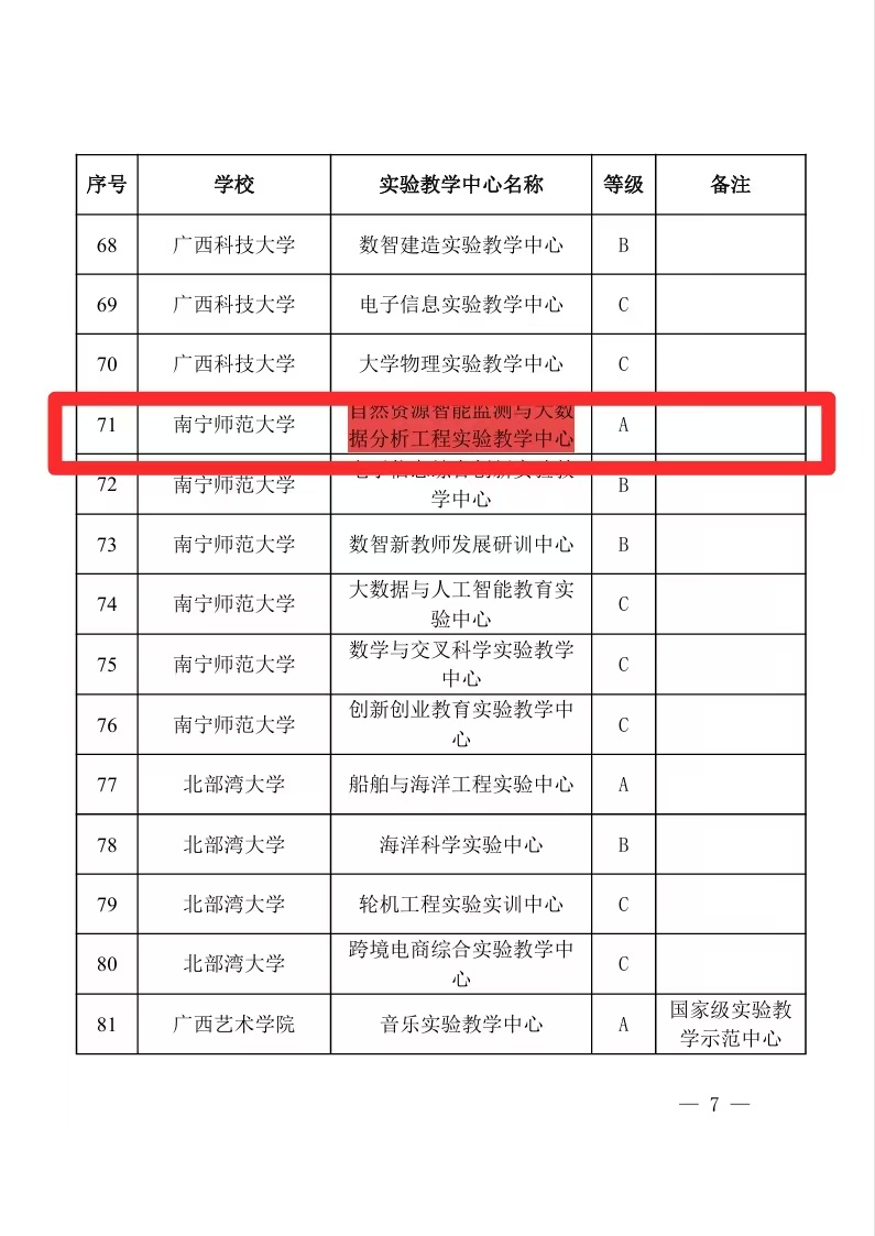 根据《自治区教育厅关于公布新一轮自治区级实验教学中心建设的通知》(桂教高教[2025]6号),经专家评审,自治区教育厅审定,我校自然资源与测绘学院段炼教授牵头申报的“自然资源智能监测与大数据分析工程实验教学中心”成功入选自治区级实验教学中心,且为本轮评选中我校唯一的A类中心。该中心既是学院实施党建引领高质量发展工程成果,也是继学院成功获批“卫星+”空间AI自然资源智能治理广西高校工程研究中心后,又一项教学科研平台的建设成果。