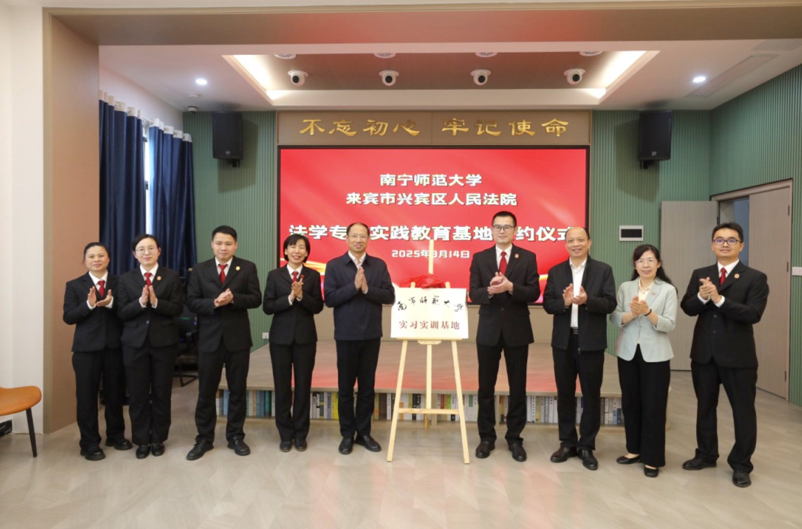 为深化院校合作,推动法学专业实践教学与就业工作深度融合,3月14日下午,法学与社会学院一行前往来宾市兴宾区人民法院开展访企拓岗活动并举行法学专业实习实训基地授牌仪式。法学与社会学院院长尹文嘉教授、副院长卢明威研究员、法律系龚战梅教授和中国-东盟数字法学研究院副院长兰敬博士共同出席。兴宾区法院党组书记、院长廖干豪,副院长覃仪晏,副院长曾德文,以及审管办、综合办、政治部相关负责同志参加座谈。