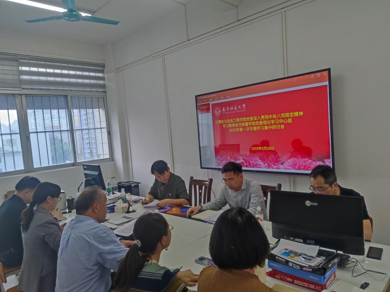 3月28日,计算机与信息工程学院/曙光大数据学院在明秀校区工会楼704会议室召开学院党委深入贯彻中央八项规定精神学习教育读书班暨学院党委理论学习中心组2025年第一次专题学习集中研讨会。学院党委理论学习中心组成员及专职组织员、纪委委员参加会议,学院党委副书记(主持党委工作)黄江涛主持会议并讲话。