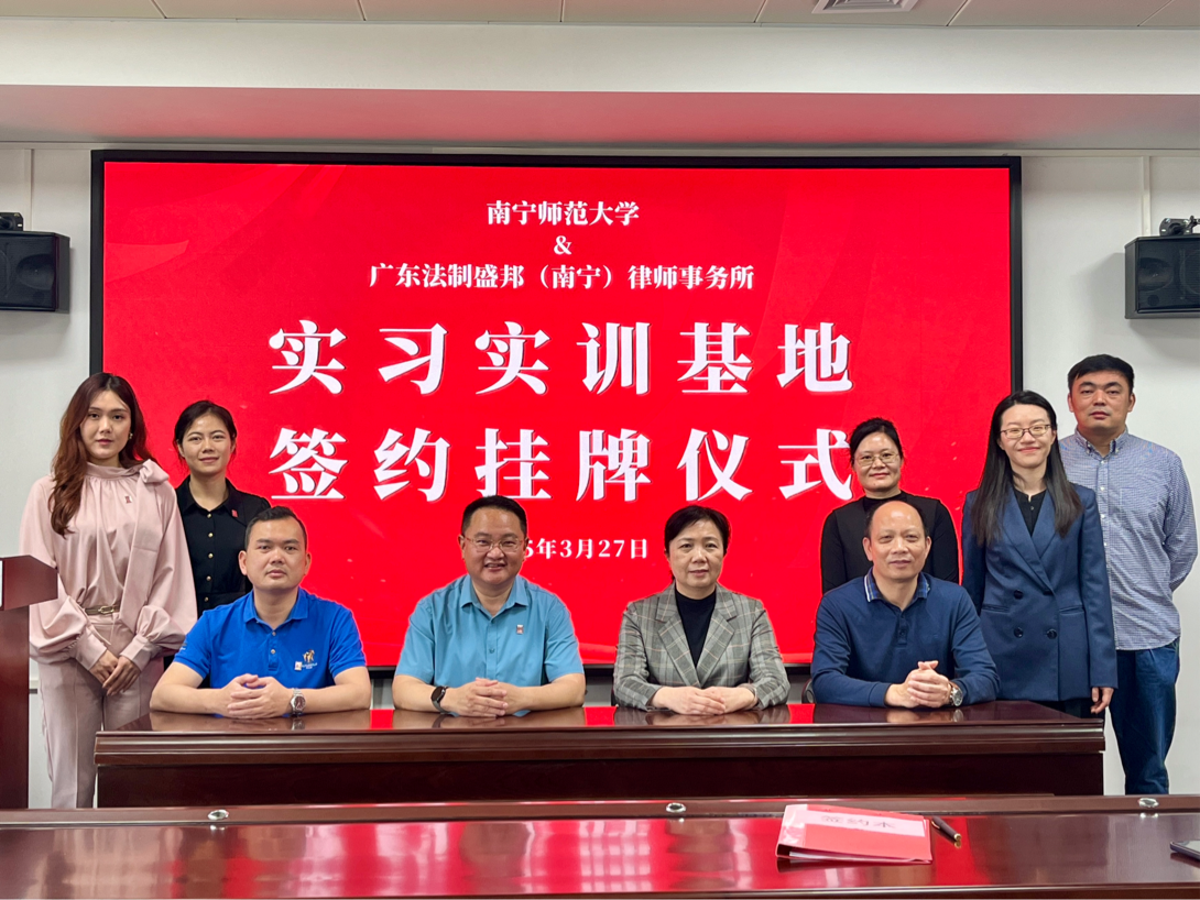 3月27日,法学与社会学院与广东法制盛邦(南宁)律师事务(以下简称“南宁分所”)共建实习实训基地签约挂牌仪式圆满举行。学院党委书记许建、副院长卢明威、院长助理兼法律系主任陈文琼、法律系副主任黎曦、南宁分所王小兵律师及执行主任梁瑞迎律师、副主任王心卓律师、杨晓梅律师、广西一起普法文化公司总经理徐鑫及学生代表共同参与了此次签约挂牌仪式。