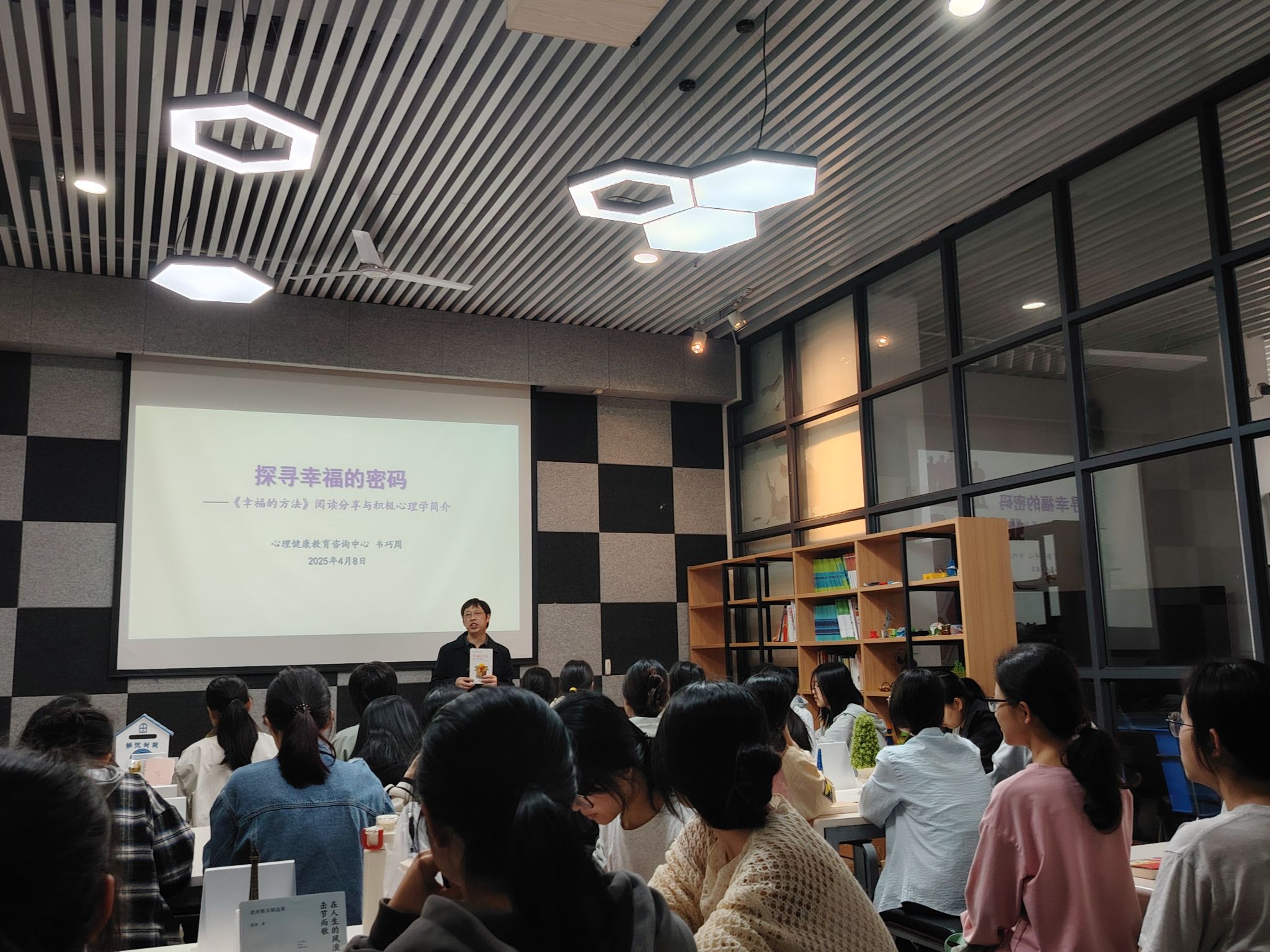 4月8日,在五合校区创客中心开展的《探寻幸福的密码》主题分享会中,我校心理健康教育咨询中心韦巧周老师以哈佛大学泰勒·本—沙哈尔教授著作《幸福的方法》为引,剖析“幸福=快乐+意义”的核心公式,结合“优势放大”、“心灵除草”等积极心理学理论,阐释自我接纳、潜能发掘对构建幸福观的重要性。“幸福不是纠结于未得,而是珍惜已拥”、“承认平凡方能超越平凡”等师生互动金句引发强烈共鸣。师生互动环节,针对“如何走出痛苦”的提问,韦老师以自己年轻时成长经历为例,强调“阅读赋予我们理解伤痛的多元视角,而时间会沉淀出成长的力量”。