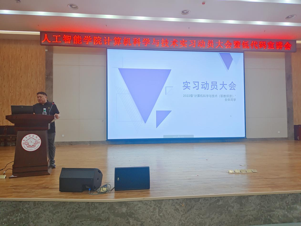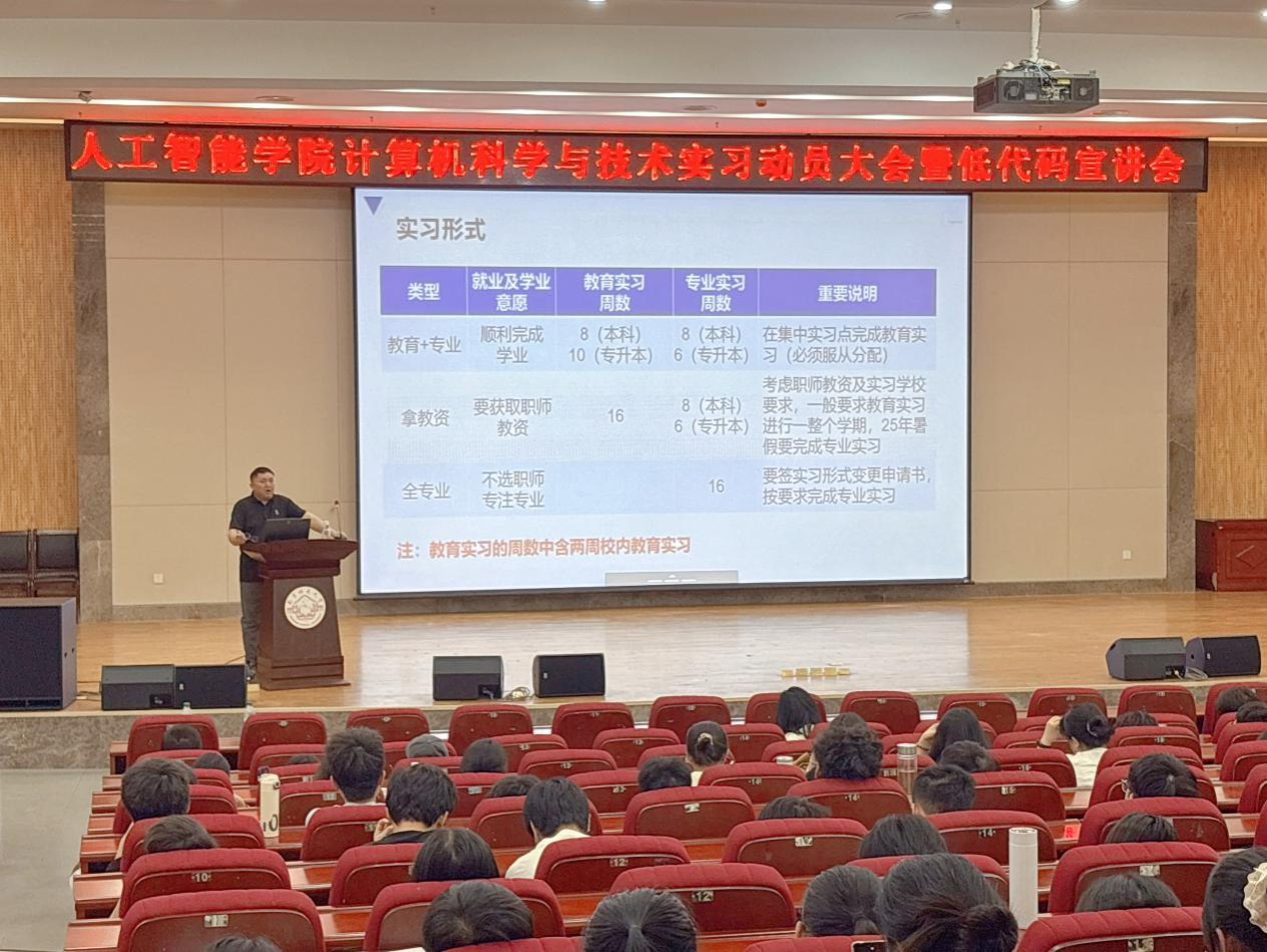为确保实习工作的顺利开展,提高学生对专业实习重要性认识,强化学生的实习安全意识和责任意识,4月29日,人工智能学院在图书馆报告厅成功召开2022级计算机科学与技术专业实习动员大会。计算机教研室主任李行老师主持会议,全体2022级计算机科学与技术专业学生参会。