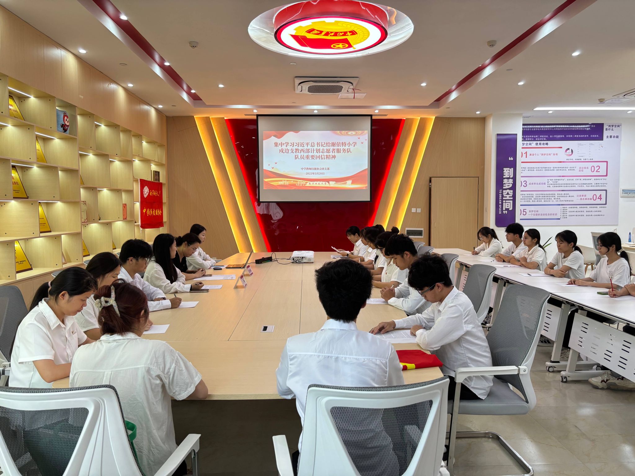 为深入学习习近平总书记给谢依特小学戍边支教西部计划志愿者服务队队员回信精神,激励青年学子勇担时代使命,5月20日,全国高校“活力社团”中学教师技能协会团支部在武鸣校区第二课堂体验中心组织开展了集中学习回信精神活动。校团委负责人与中学教师技能协会团支部成员参加本次活动。