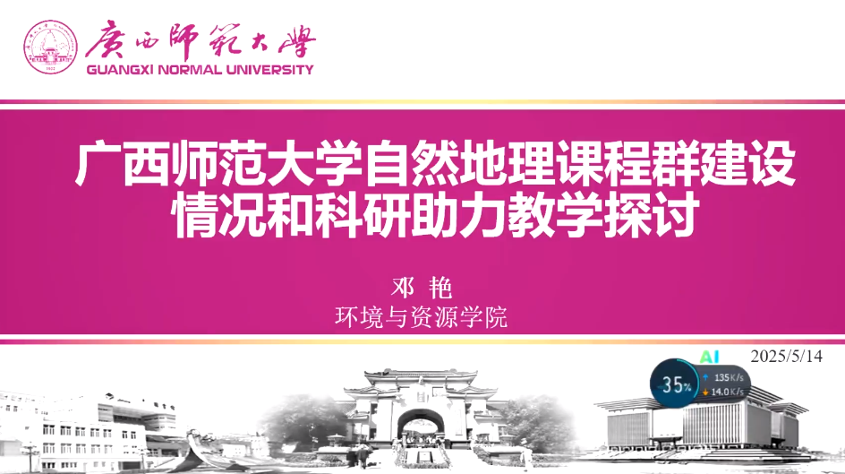 广西师范大学环境与资源学院邓艳教授以“自然地理课程群建设情况和科研助力教学探讨”为主题,详细介绍了该校自然地理课程群的建设成果与未来规划,并以自然地理课程群为例,从项目助力教学、成果进教学、思路引教学三个角度,分享了科研反哺教学的创新模式。