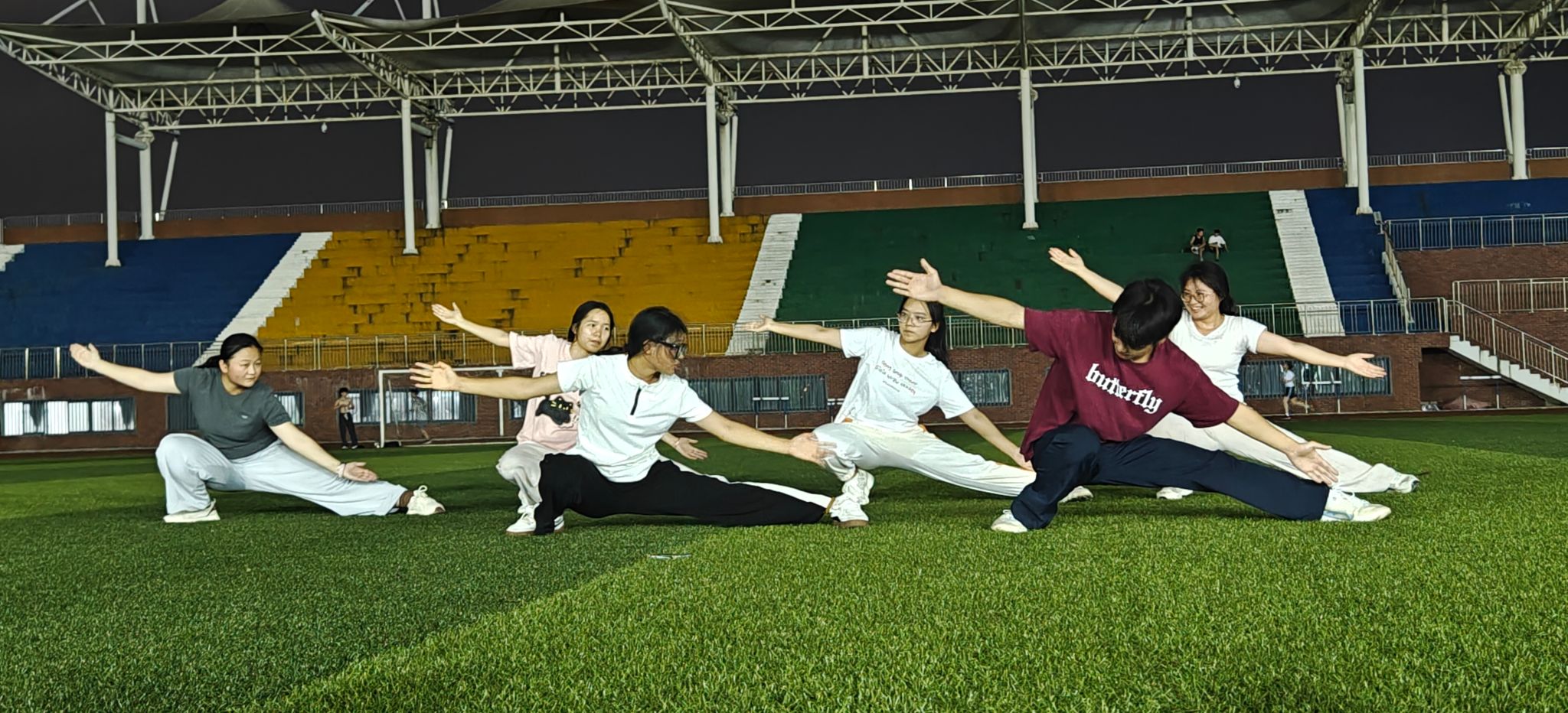 夏夜繁星闪烁,操场灯火通明,松园田径场化身为武术课堂。本次武术夜校教练团队由武术协会学生组成,结合趣味教学法,将八段锦的舒缓柔美与五步拳的刚劲利落融入课程,通过口诀记忆、分组比拼等方式,让零基础学员快速掌握动作要领。活动过程还融入健身知识科普、运动损伤防护技巧等内容,帮助学员们科学锻炼。训练过程中,学员们手持夜光器械,一招一式在灯光下整齐划一,展现出学习武术的顽强精气神,成为校园独特的文化风景线。“从手脚不协调到能完整打出套路,武术让我变得更自信!”许多学员因此次武术夜校结缘,组建起“夜练小分队”,发挥交流平台作用。