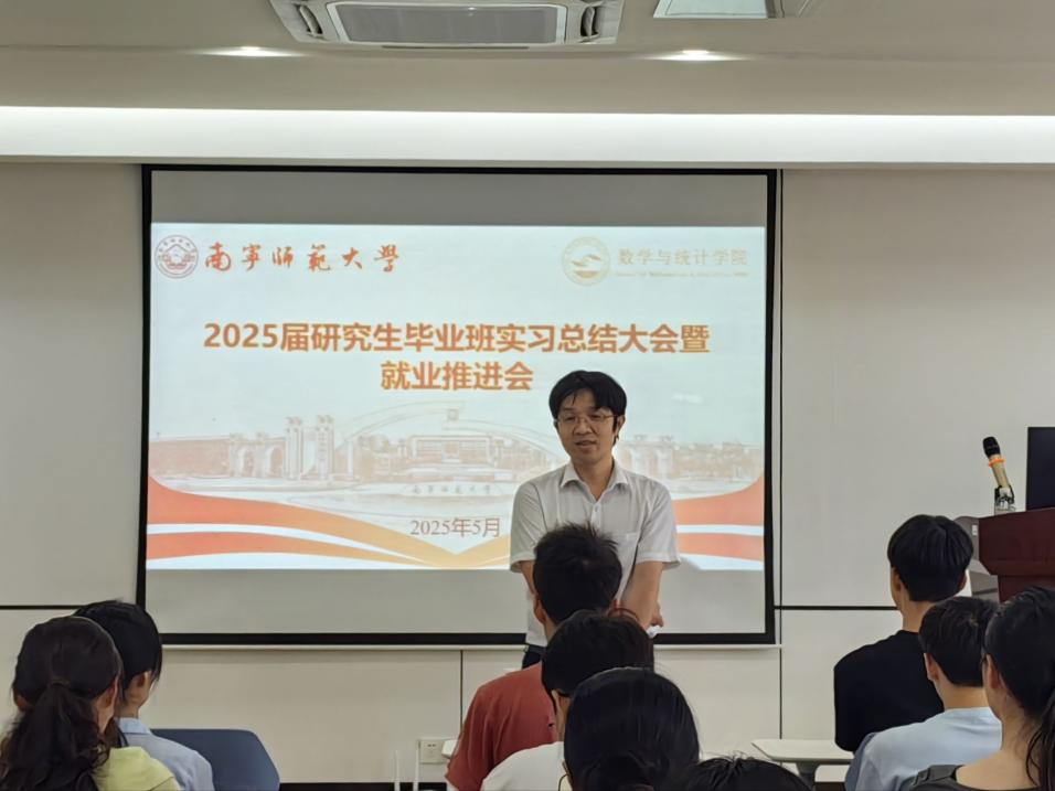 5月23日,数学与统计学院2025届研究生毕业班实习总结大会暨就业推进会在实验1-A602举行,学院副院长刘利斌、2023级专硕研究生和2021级农硕研究生到场参与,会议由林敏华老师主持。